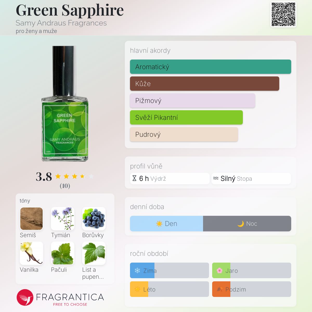 Green Sapphire podle Samy Andraus Fragrances je Woody vůně pro ženy a muže. Green Sapphire byl/a uveden/a v roce 2021. Vrchní tóny jsou Tymián, Borůvky a Černý rybíz; střední tóny jsouSkořice, Jasmín a Cedr ; základní tóny jsou Semiš, Vanilka, Pačuli a Dubový mech.