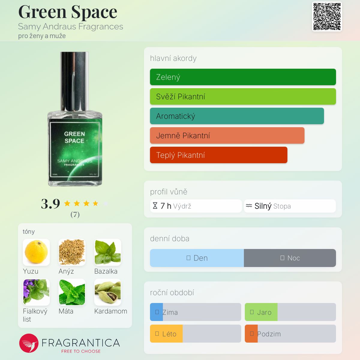 Green Space podle Samy Andraus Fragrances je Aromatic Green vůně pro ženy a muže. Green Space byl/a uveden/a v roce 2021. Vrchní tóny jsou Yuzu, Anýz a Bazalka; střední tóny jsouFialkový list, Máta a Kardamom ; základní tóny jsou Lékořice a Olibanum.