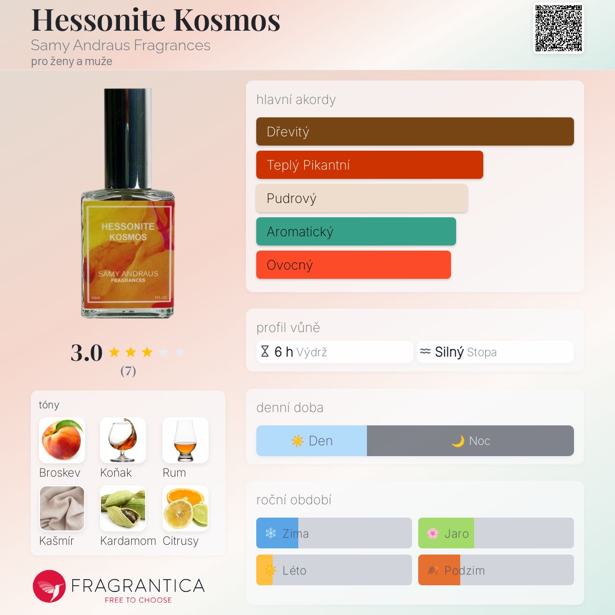 Hessonite Kosmos podle Samy Andraus Fragrances je vůně pro ženy a muže. Hessonite Kosmos byl/a uveden/a v roce 2021. Vrchní tóny jsou Broskev, Kardamom, Citrusy a Pačuli; střední tóny jsouKoňak, Rum, Davana a Jasmín ; základní tóny jsou Kašmír, Santalové dřevo, Vanilka a Vetiver.