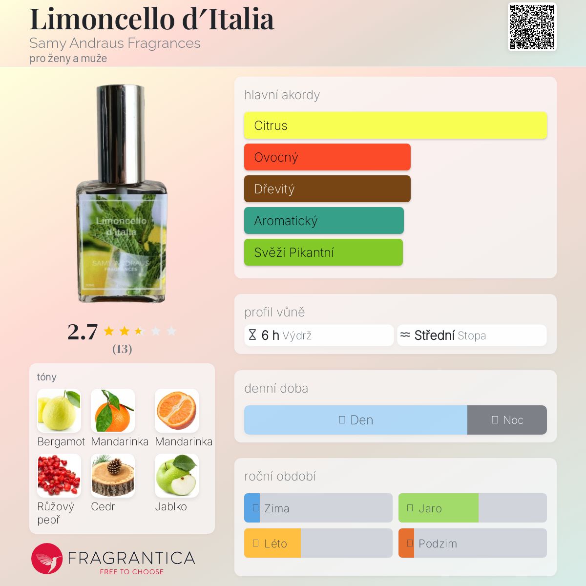 Limoncello d′Italia podle Samy Andraus Fragrances je Citrus vůně pro ženy a muže. Limoncello d′Italia byl/a uveden/a v roce 2020. Vrchní tóny jsou Bergamot, Mandarinka, Mandarinka a Růžový pepř; střední tóny jsouCedr a Jablko ; základní tóny jsou Haitský vetiver a Bílé pižmo.