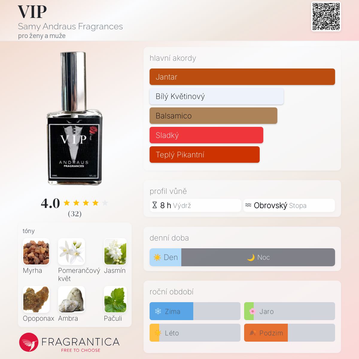 VIP podle Samy Andraus Fragrances je Orientální vůně pro ženy a muže. VIP byl/a uveden/a v roce 2020. Vrchní tóny jsou Pomerančový květ a Jasmín; střední tóny jsouMyrha, Opoponax a Benzoin ; základní tóny jsou Černý jantar a Pačuli.
