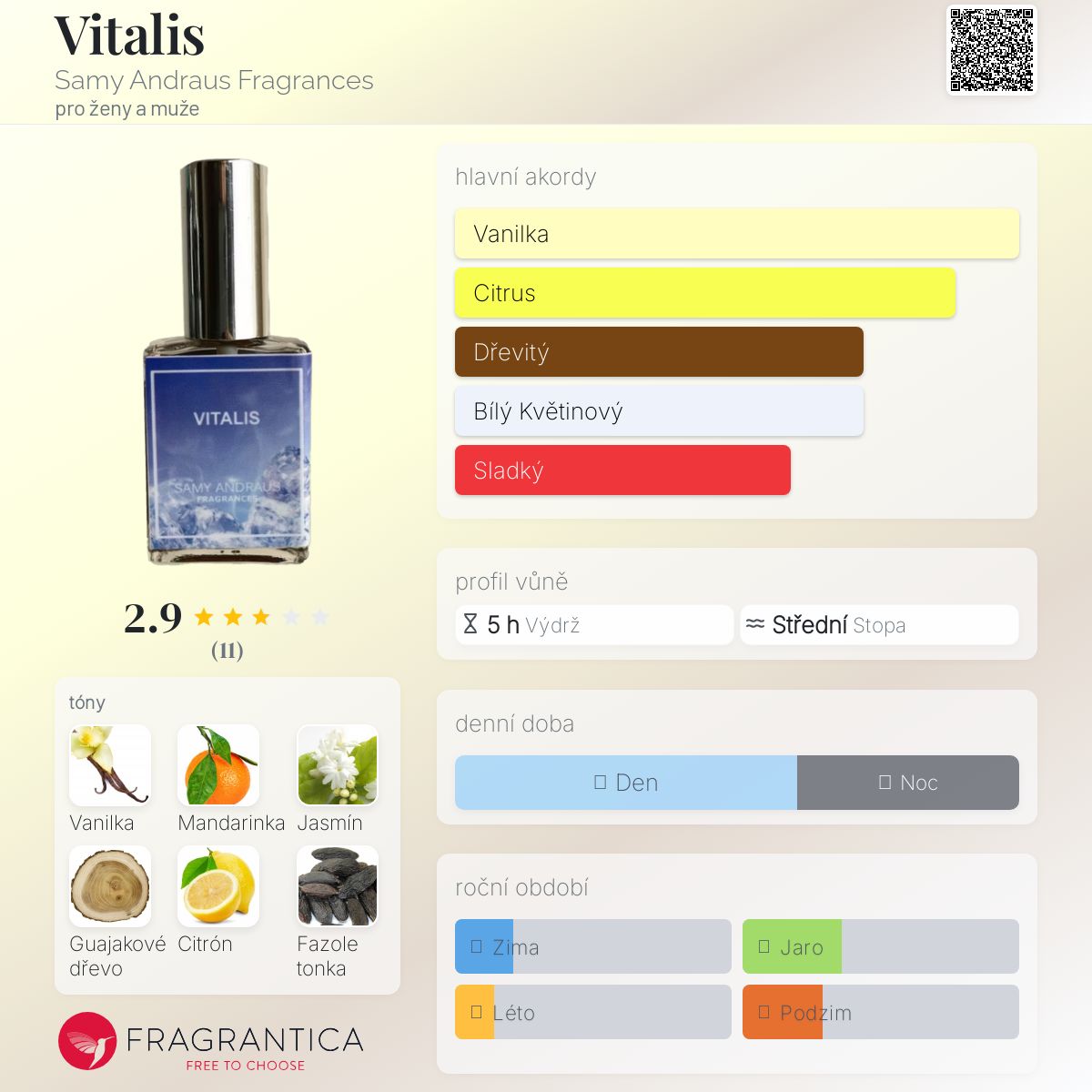 Vitalis podle Samy Andraus Fragrances je Citrus vůně pro ženy a muže. Vitalis byl/a uveden/a v roce 2020. Vrchní tóny jsou Sicilská mandarinka a Citrón; střední tóny jsouVanilka a Jasmín ; základní tóny jsou Guajakové dřevo a Fazole tonka.
