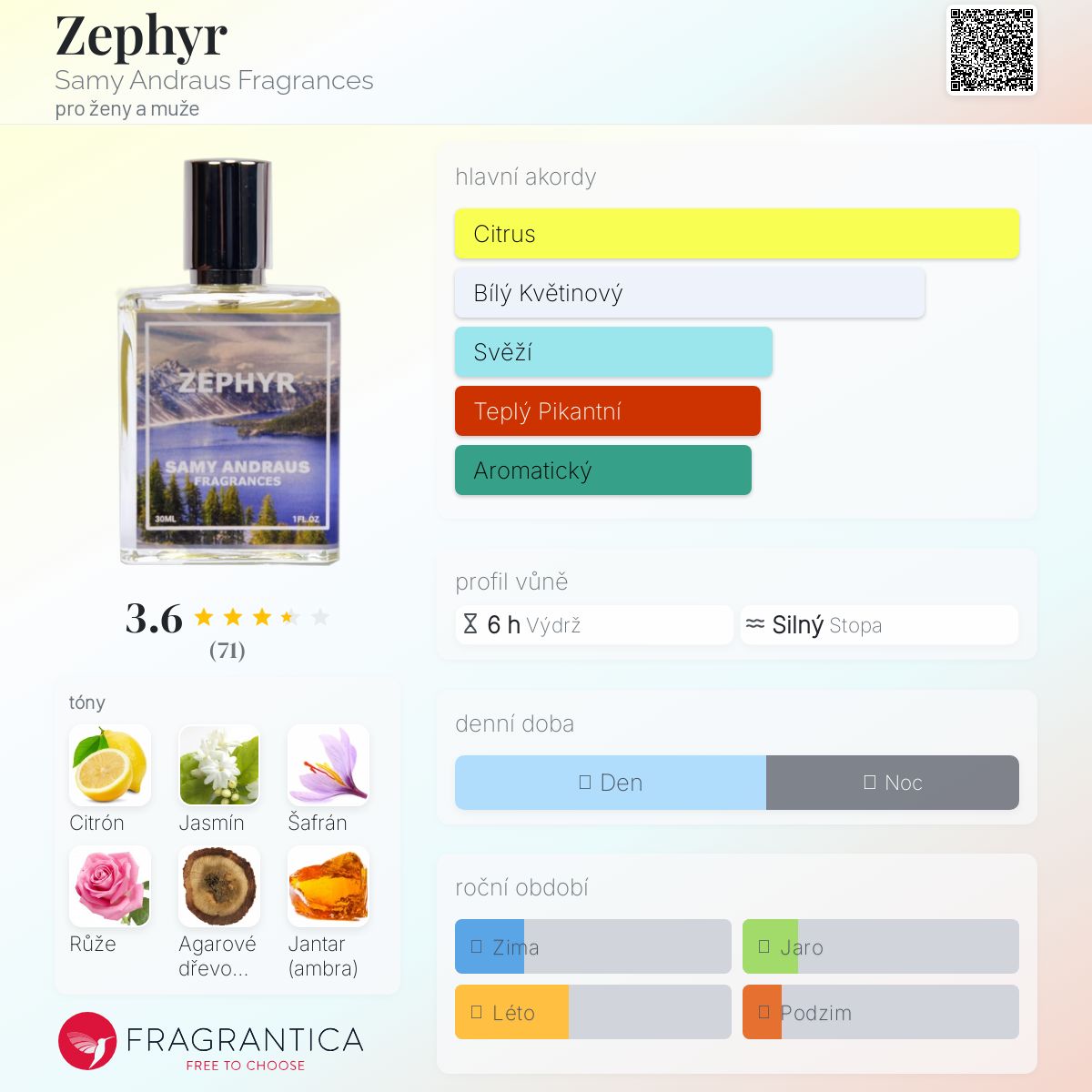 Zephyr podle Samy Andraus Fragrances je Aromatic vůně pro ženy a muže. Zephyr byl/a uveden/a v roce 2019. Vrchní tóny jsou Citrón, Šafrán a Šalvěj; střední tóny jsouJasmín a Růže ; základní tóny jsou Agarové dřevo (oud) a Jantar (ambra).
