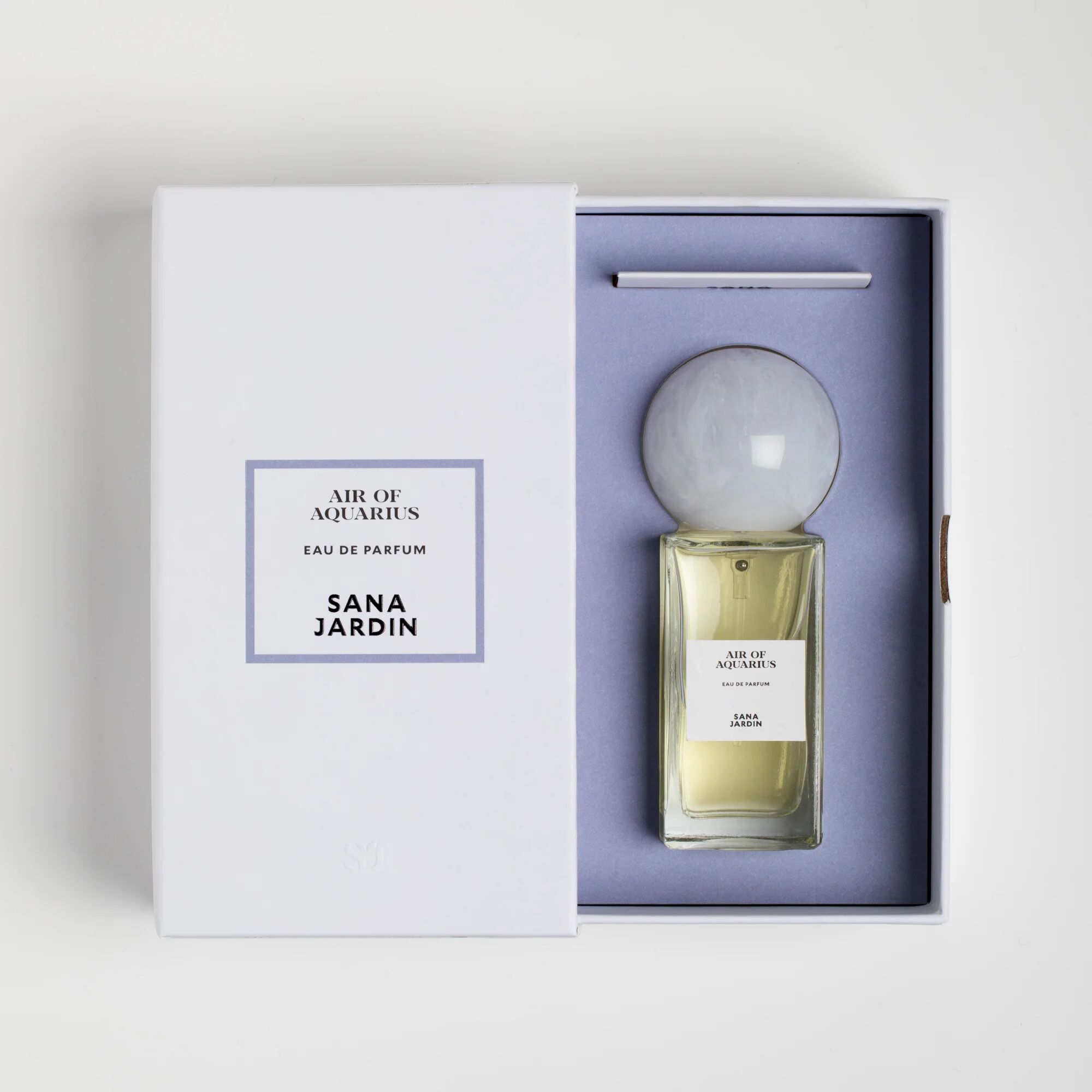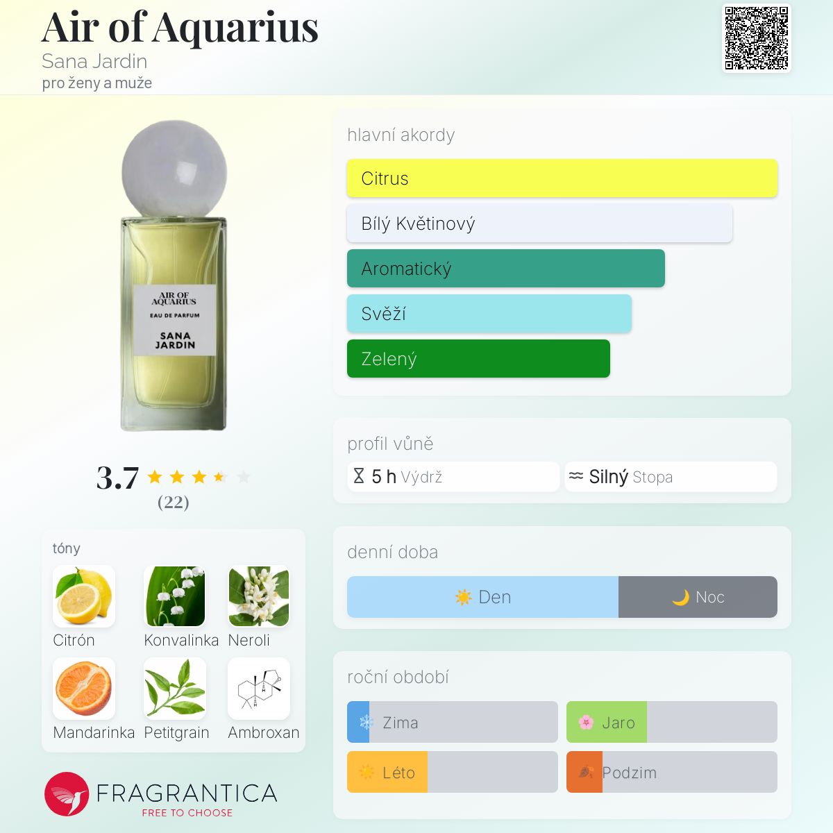 Air of Aquarius podle Sana Jardin je Aromatic Fruity vůně pro ženy a muže. Toto je nová vůně. Air of Aquarius byl/a uveden/a v roce 2025. Vrchní tóny jsou Citrón, Mandarinka a Petitgrain; střední tóny jsouKonvalinka, Tuniské neroli, Levandule, Rozmarýn a Jasmín ; základní tóny jsou Ambroxan a Pižmo.
