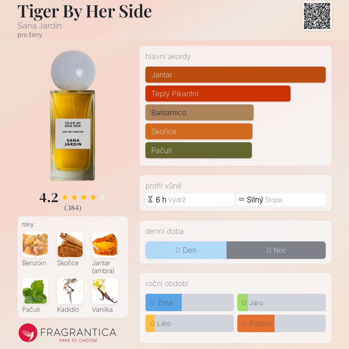 Tiger By Her Side podle Sana Jardin je Orientální Floral vůně pro ženy. Tiger By Her Side byl/a uveden/a v roce 2017. "Nosem" za touto vůní je Carlos Benaïm. Vrchní tóny jsou Skořice, Koriandr a Bergamot; střední tóny jsouSiamský (thajský) benzoin, Pačuli a Marocká růže ; základní tóny jsou Jantar (ambra), Kadidlo, Vanilka a Labdanum.