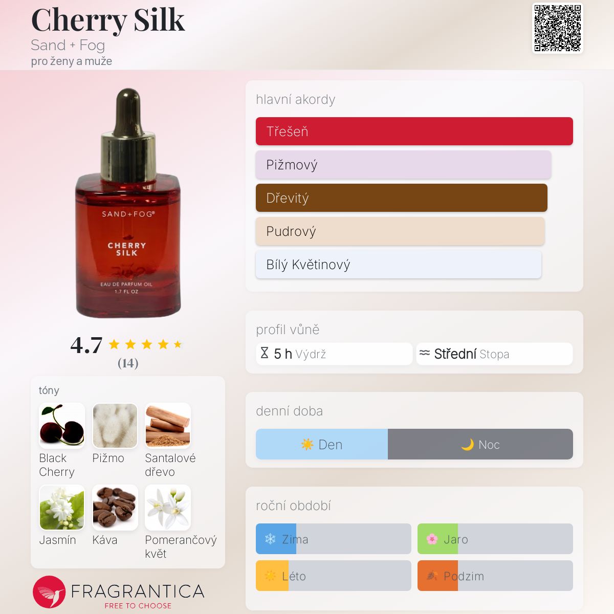 Cherry Silk podle Sand + Fog je Orientální Vanilla vůně pro ženy a muže. Toto je nová vůně. Cherry Silk byl/a uveden/a v roce 2025. Vrchní tóny jsou Černá třešeň, Černý pepř, Růžový pepř a Mandarinka; střední tóny jsouJasmín, Káva a Pomerančový květ ; základní tóny jsou Pižmo, Santalové dřevo, Vanilka a Pačuli.