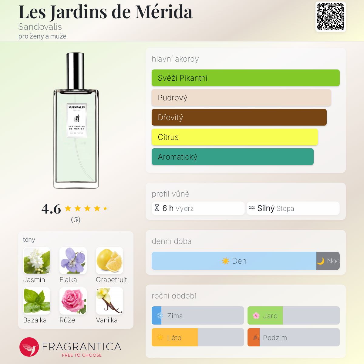 Les Jardins de Mérida podle Sandovalis je Floral vůně pro ženy a muže. Les Jardins de Mérida byl/a uveden/a v roce 2013. "Nosem" za touto vůní je José Miguel Sandovalis. Vrchní tóny jsou Jasmín a Fialka; střední tóny jsouGrapefruit, Bazalka a Růže ; základní tóny jsou Vanilka a Cedr.