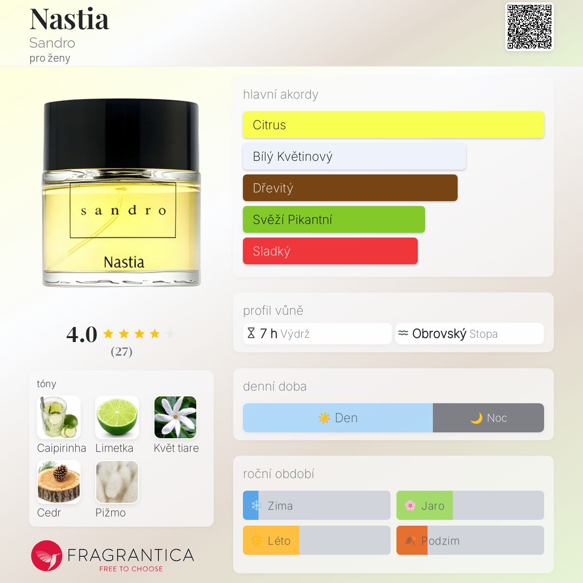 Nastia podle Sandro je Floral Woody Musk vůně pro ženy. Nastia byl/a uveden/a v roce 2015. Vrchní tóny jsou Limetka a Květ tiare; střední tón jeCaipirinha ; základní tóny jsou Cedr a Pižmo.