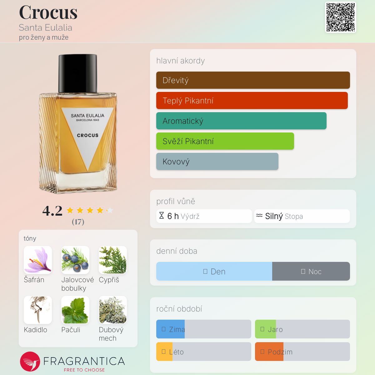 Crocus podle Santa Eulalia je Orientální Woody vůně pro ženy a muže. Crocus byl/a uveden/a v roce 2021. "Nosem" za touto vůní je Christian Provenzano. Vrchní tóny jsou Šafrán, Jalovcové bobulky a Červené bobule; střední tóny jsouCypřiš, Pačuli, Mech a Rum ; základní tóny jsou Kadidlo, Santalové dřevo, Vanilka a Vetiver.