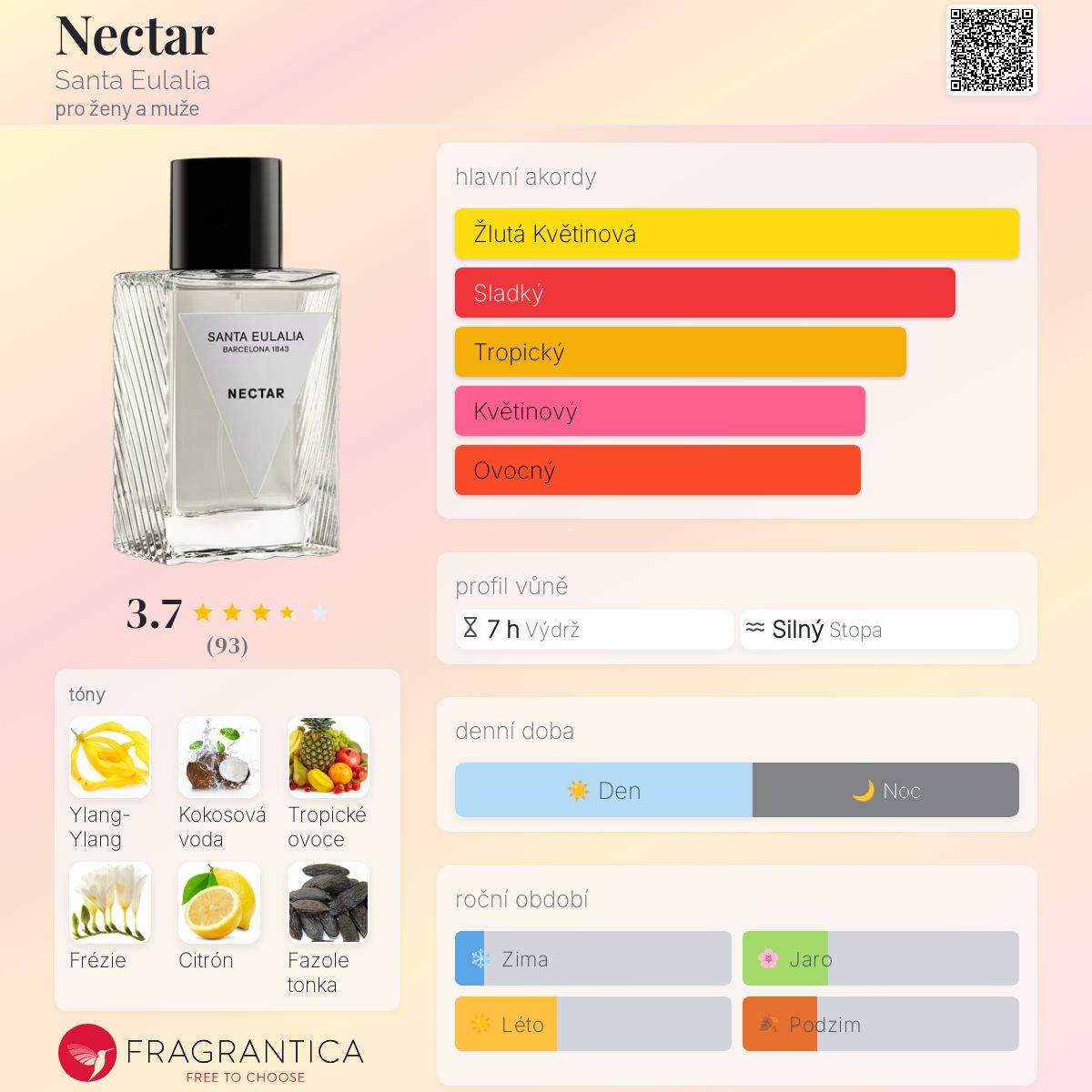 Nectar podle Santa Eulalia je Floral Fruity vůně pro ženy a muže. Nectar byl/a uveden/a v roce 2016. "Nosem" za touto vůní je Cyrill Rolland. Vrchní tóny jsou Tropické ovoce a Citrón; střední tóny jsouYlang-Ylang, Kokosová voda a Frézie ; základní tóny jsou Fazole tonka a Vanilka.