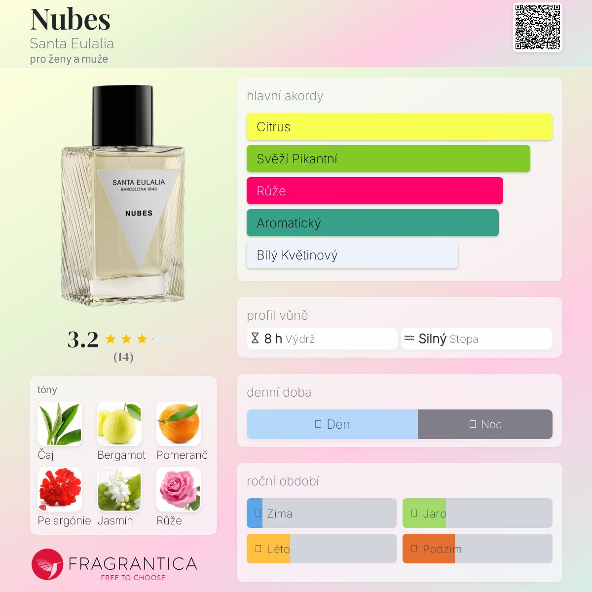 Nubes podle Santa Eulalia je Orientální Floral vůně pro ženy a muže. Nubes byl/a uveden/a v roce 2018. "Nosem" za touto vůní je Stéphane Bengana. Vrchní tóny jsou Zelený čaj, Bergamot a Pomeranč; střední tóny jsouPelargónie, Jasmín a Růže ; základní tóny jsou Vanilka, Vetiver a Jantar (ambra).