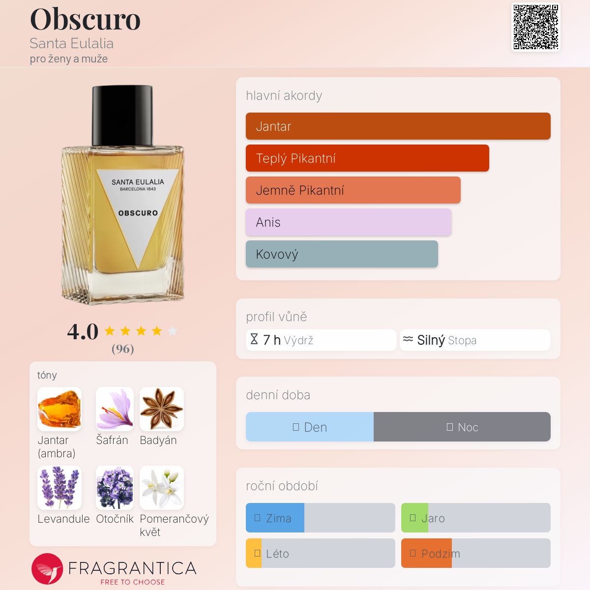 Obscuro podle Santa Eulalia je Orientální vůně pro ženy a muže. Obscuro byl/a uveden/a v roce 2014. "Nosem" za touto vůní je Cyrill Rolland. Vrchní tóny jsou Šafrán a Badyán; střední tóny jsouLevandule, Otočník a Pomerančový květ ; základní tóny jsou Jantar (ambra), Kadidlo a Karamel.