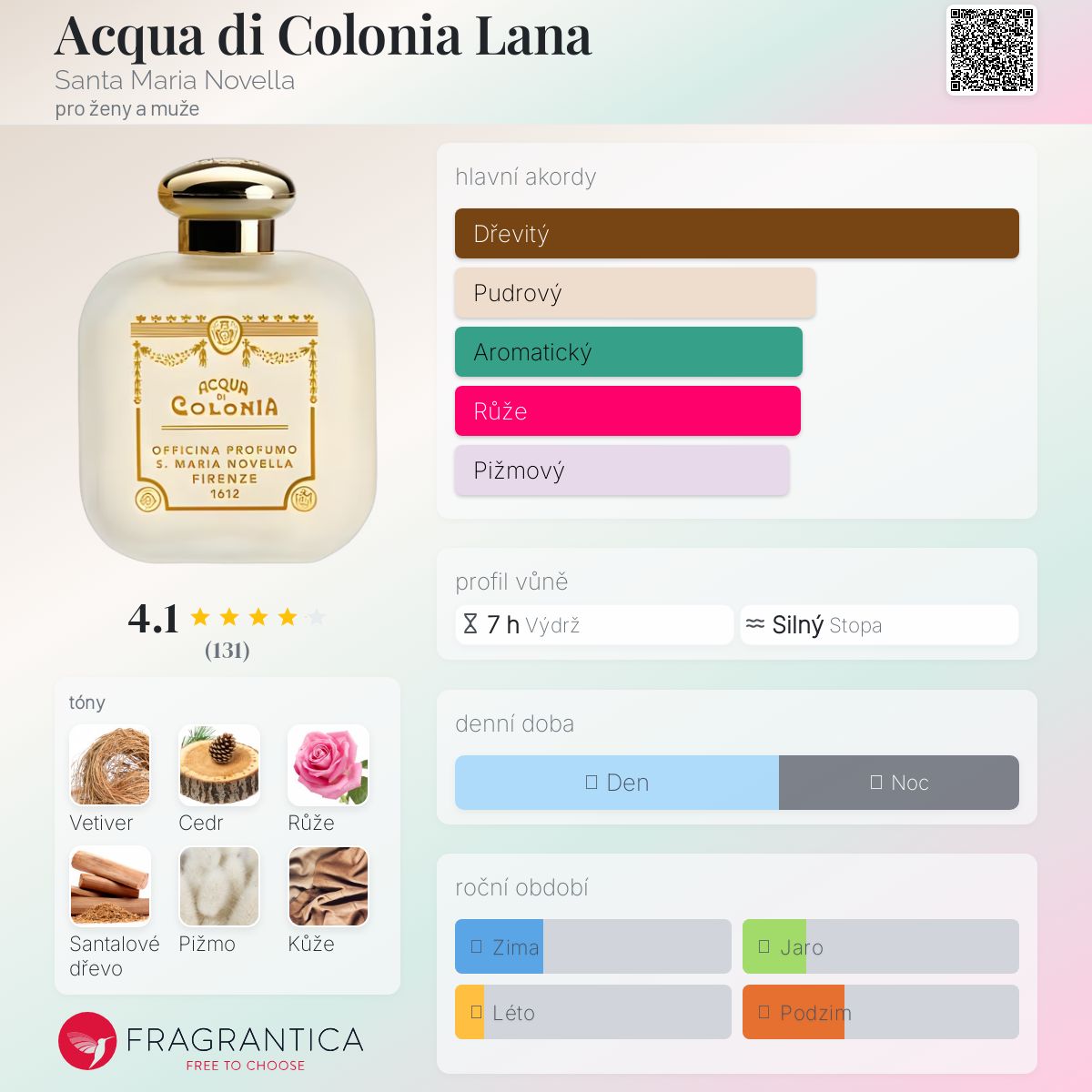 Acqua di Colonia Lana podle Santa Maria Novella je Woody vůně pro ženy a muže. Acqua di Colonia Lana byl/a uveden/a v roce 2017.