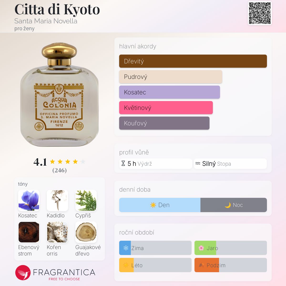 Citta di Kyoto podle Santa Maria Novella je Floral Woody Musk vůně pro ženy. Citta di Kyoto byl/a uveden/a v roce 2005. Vrchní tóny jsou Hloh, Hyacint, Ylang-Ylang, Bergamot, Pomeranč, Jasmín a Růže; střední tóny jsouKosatec, Cypřiš, Bříza, Lotus, Levandule, Broskev, Švestka a Skořice ; základní tóny jsou Kadidlo, Ebenové dřevo, Orris, Guajakové dřevo, Virginský cedr, Santalové dřevo, Pižmo, Jantar (ambra), Vanilka a Pačuli.