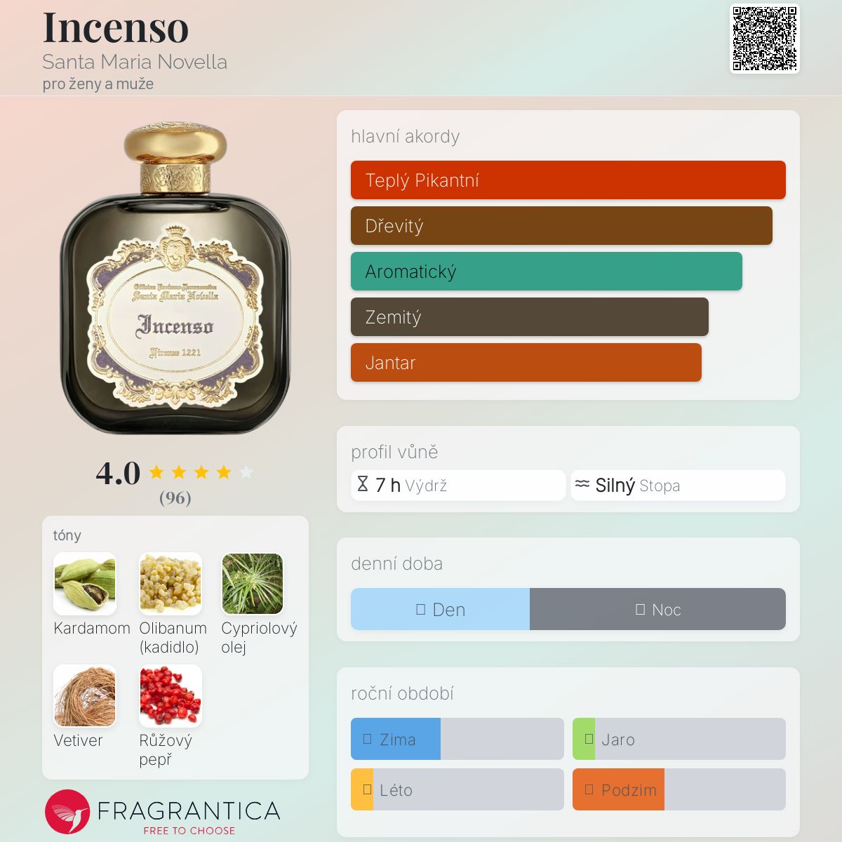 Incenso podle Santa Maria Novella je Orientální Woody vůně pro ženy a muže. Toto je nová vůně. Incenso byl/a uveden/a v roce 2024. Vrchní tóny jsou Kardamom a Růžový pepř; střední tóny jsouKadidlo a Cypriolový olej ; základní tón je Vetiver.