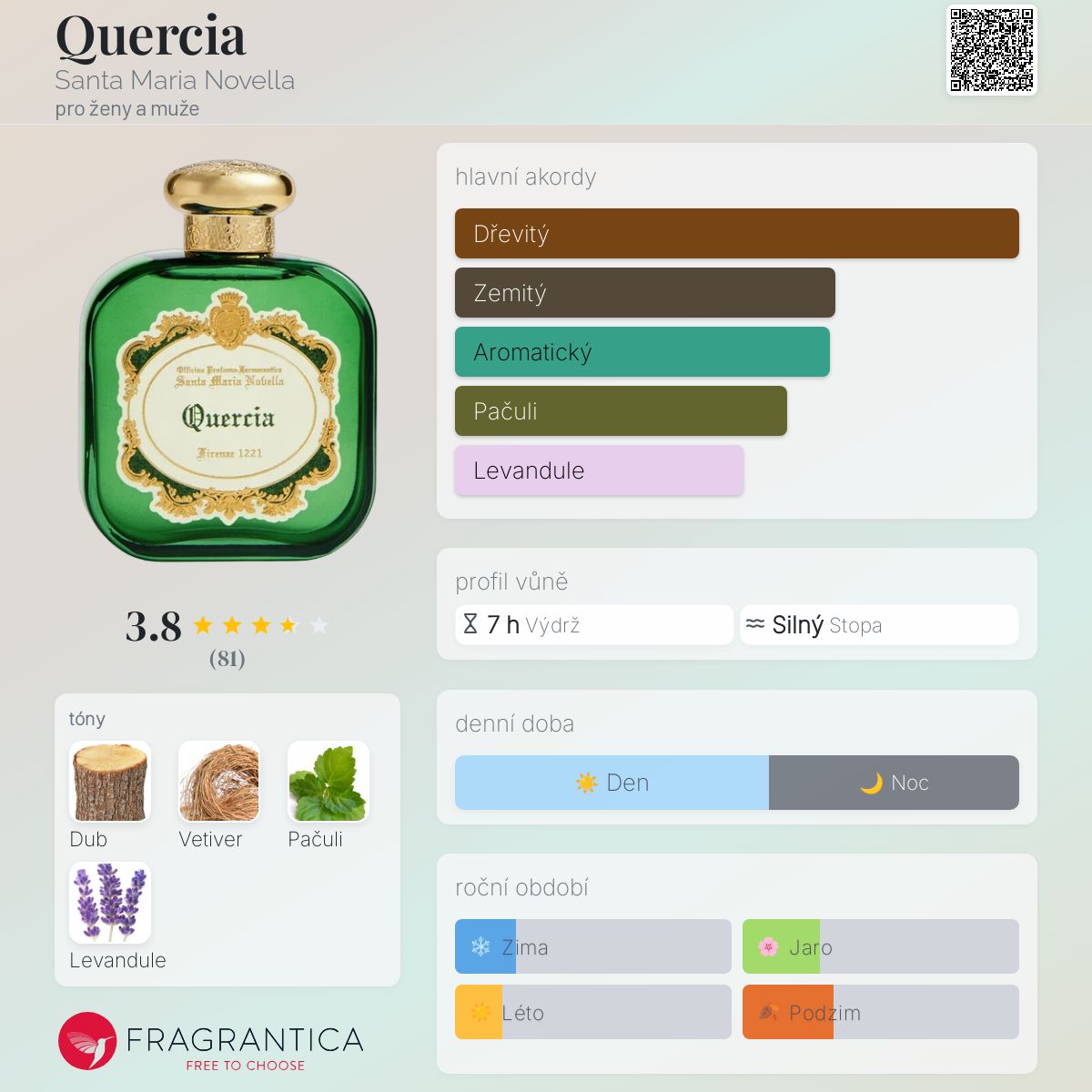 Quercia podle Santa Maria Novella je Woody Aromatic vůně pro ženy a muže. Toto je nová vůně. Quercia byl/a uveden/a v roce 2024. Vrchní tón je Levandule ; střední tóny jsouVetiver a Pačuli ; základní tón je Dub.