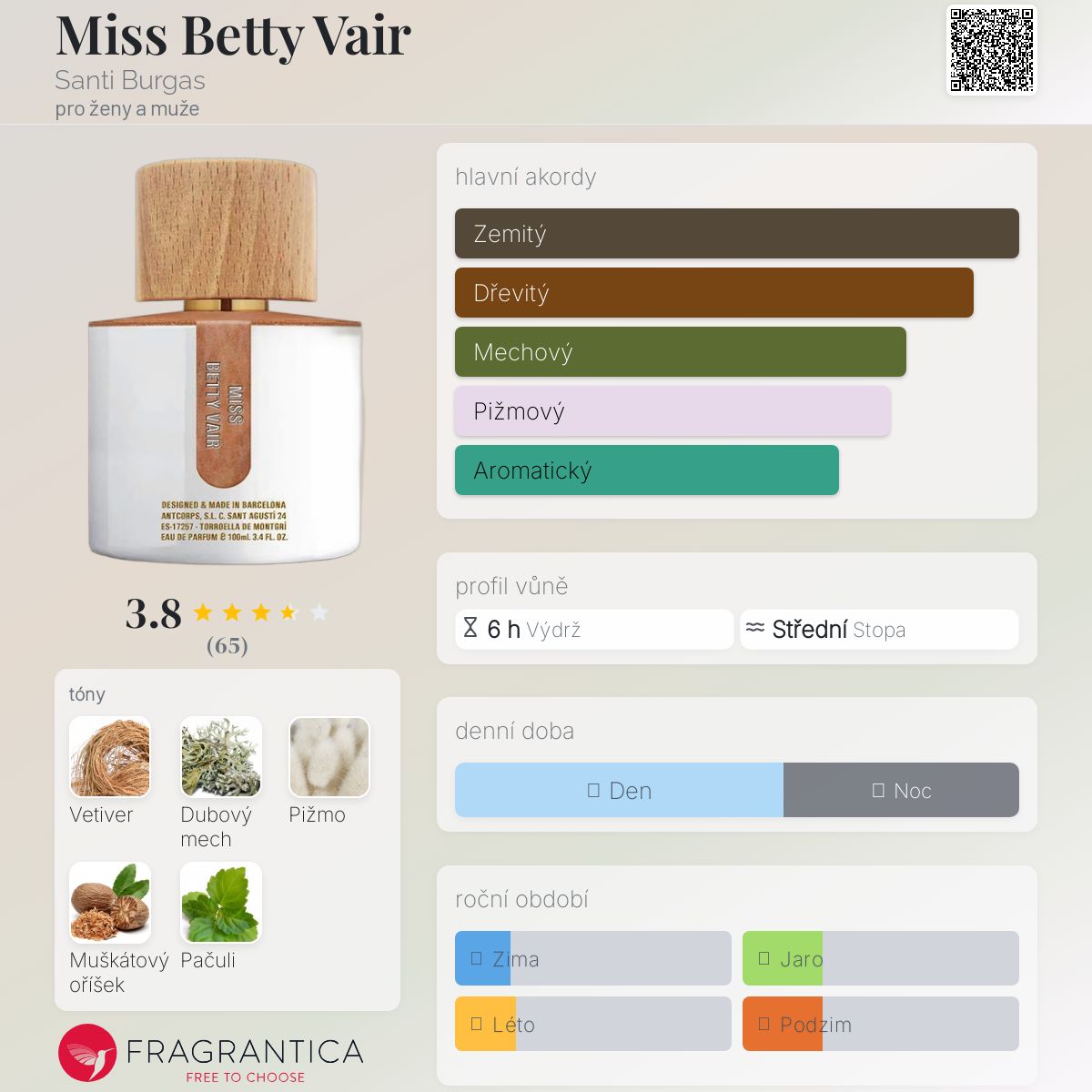 Miss Betty Vair podle Santi Burgas je Woody Spicy vůně pro ženy a muže. Miss Betty Vair byl/a uveden/a v roce 2015. "Nosem" za touto vůní je Santi Burgas.
