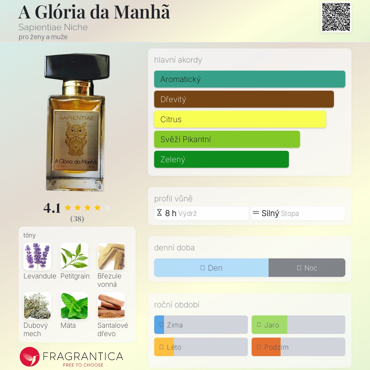 A Glória da Manhã podle Sapientiae Niche je Chypre vůně pro ženy a muže. A Glória da Manhã byl/a uveden/a v roce 2016. "Nosem" za touto vůní je Sanderson Santana. Vrchní tóny jsou Levandule, Petitgrain, Sicilský citron, Yuzu, Černý rybíz, Neroli, Hořká mandle, Bergamot a Mandarinka; střední tóny jsouMáta, Santalové dřevo, Africká pelargonie, Šalvěj, Cedr, Polní květiny, Dub a Zelené jablko ; základní tóny jsou Březule vonná, Dubový mech, Kumarin, Jantar (ambra), Pižmo a Bílé pižmo.