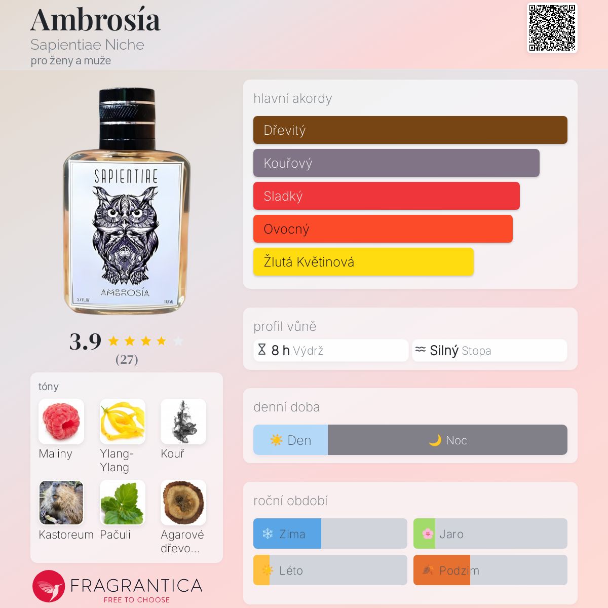 Ambrosía podle Sapientiae Niche je Orientální Spicy vůně pro ženy a muže. Ambrosía byl/a uveden/a v roce 2019. "Nosem" za touto vůní je Sanderson Santana. Vrchní tóny jsou Kouř a Muškátový oříšek; střední tóny jsouMaliny, Ylang-Ylang a Cedr ; základní tóny jsou Kastoreum, Pačuli, Agarové dřevo (oud) a Styrax.