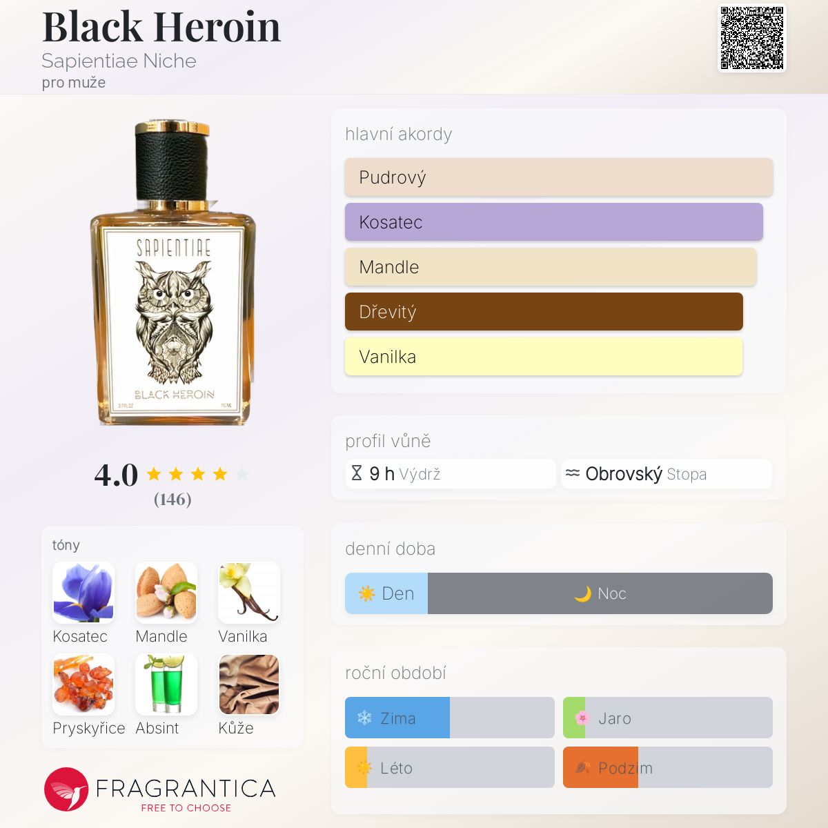 Black Heroin podle Sapientiae Niche je Orientální Woody vůně pro muže. Black Heroin byl/a uveden/a v roce 2018. "Nosem" za touto vůní je Sanderson Santana. Vrchní tóny jsou Mandle, Vanilka a Madagaskarská vanilka; střední tóny jsouČerný kosatec, Absint a Ylang-Ylang ; základní tóny jsou Vanilka, Pryskyřice, Kůže, Agarové dřevo (oud), Santalové dřevo, Pačuli a Dubový mech.