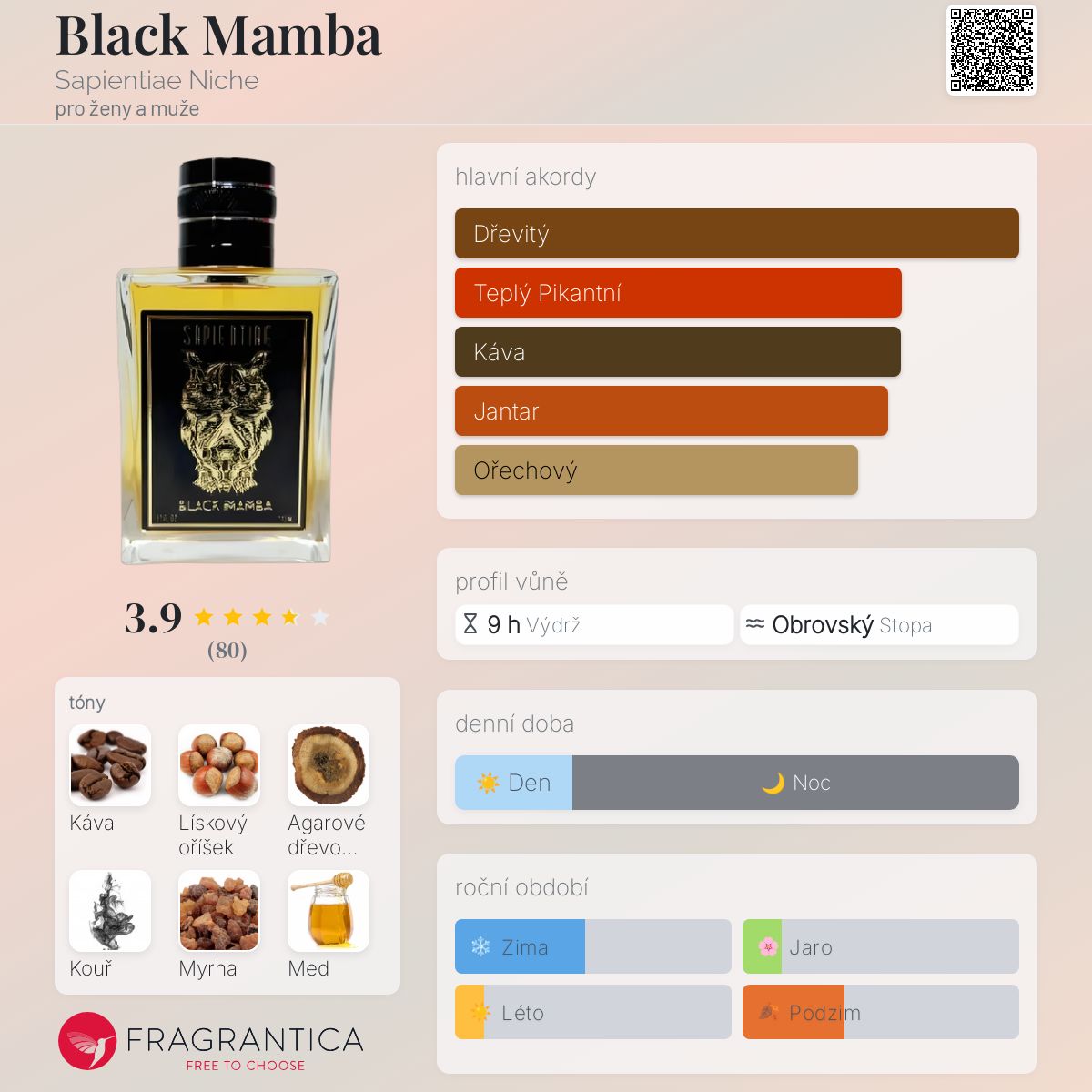 Black Mamba má identitu, která se příliš nepodobá ostatním parfémům Sapientiae Niche, a to z jednoho prostého důvodu: káva. Právě tato nóta bezvadně začíná i končí příběh "hadů v dunách" (viz popis výrobce na webových stránkách) a vytváří ve světě parfémů jedinečný čichový zážitek.