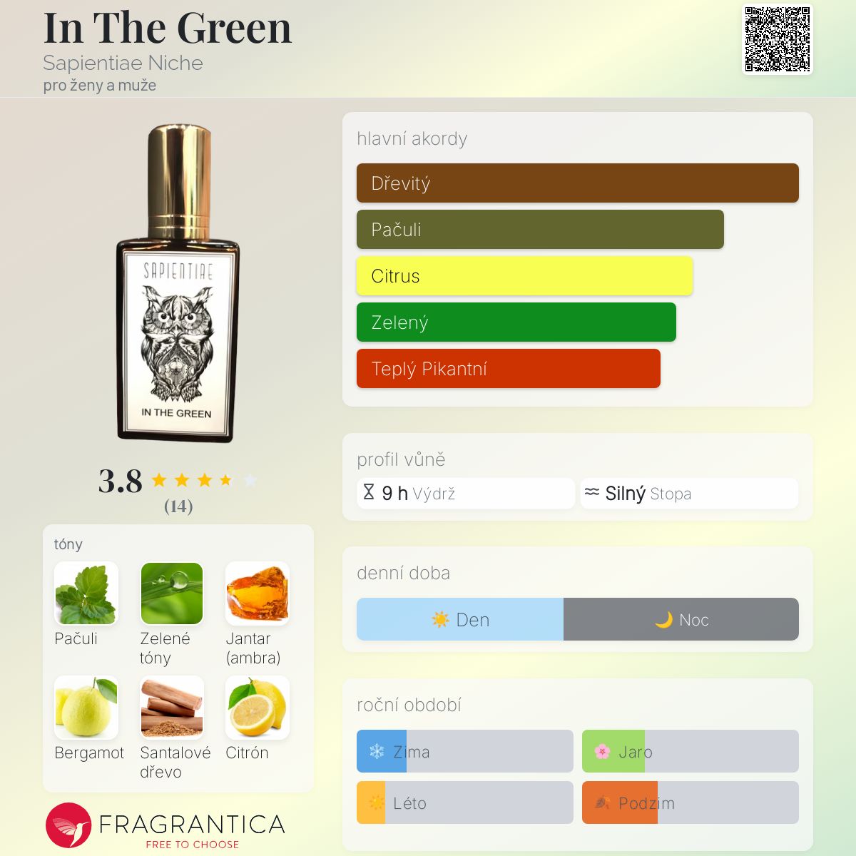 In The Green podle Sapientiae Niche je Citrus Aromatic vůně pro ženy a muže. In The Green byl/a uveden/a v roce 2018. "Nosem" za touto vůní je Sanderson Santana. Vrchní tóny jsou Zelené tóny, Bergamot a Sicilský citron; střední tóny jsouSantalové dřevo, Cedr a Konvalinka ; základní tóny jsou Pačuli, Jantar (ambra) a Dubový mech.