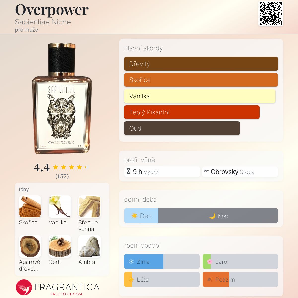 Overpower podle Sapientiae Niche je Orientální vůně pro muže. Overpower byl/a uveden/a v roce 2018. "Nosem" za touto vůní je Sanderson Santana. Vrchní tóny jsou Čínské skořicové dřevo, Černá orchidej a Galbanum; střední tóny jsouBřezule vonná, Extrakt z bílého cedru a Jasmín ; základní tóny jsou Vanilka, Agarové dřevo (oud) a Ambra.
