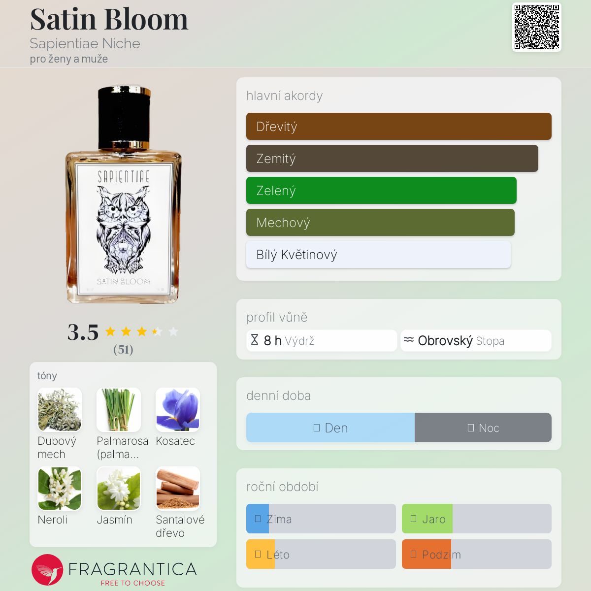 Satin Bloom podle Sapientiae Niche je Chypre Floral vůně pro ženy a muže. Satin Bloom byl/a uveden/a v roce 2018. "Nosem" za touto vůní je Sanderson Santana. Vrchní tóny jsou Palmarosa (palma růžová), Bergamot a Pomeranč; střední tóny jsouKosatec, Neroli a Jasmín Sambac ; základní tóny jsou Dubový mech, Santalové dřevo a Pačuli.