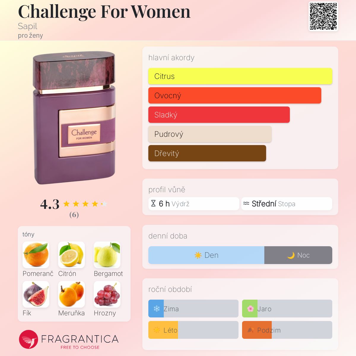 Challenge For Women podle Sapil je vůně pro ženy. Vrchní tóny jsou Pomeranč, Citrón a Bergamot; střední tóny jsouFík, Meruňka, Hrozny a Granátové jablko ; základní tóny jsou Jantar (ambra), Pižmo a Vanilka.