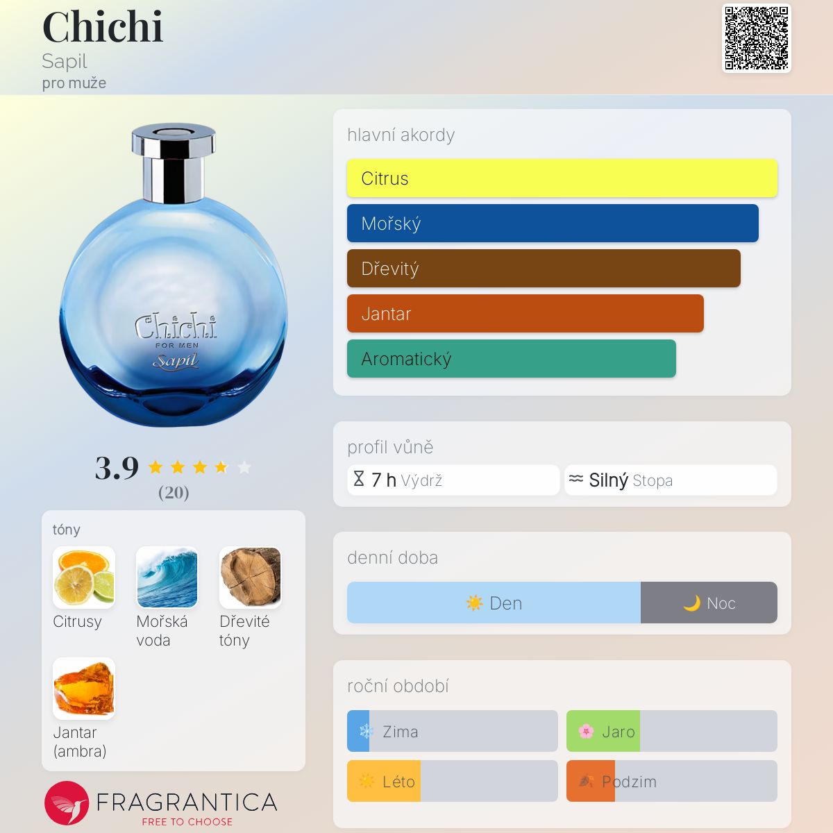 Chichi podle Sapil je Aromatic Aquatic vůně pro muže. Chichi byl/a uveden/a v roce 2008. Vrchní tón je Citrusy ; střední tón jeMořské tóny ; základní tóny jsou Dřevité tóny a Jantar (ambra).