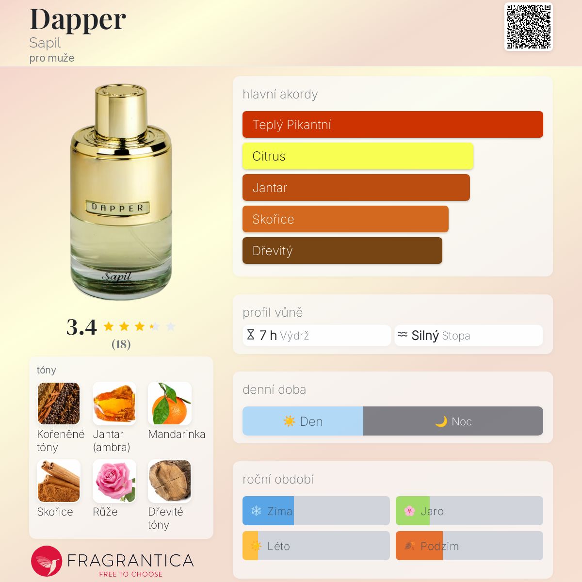 Dapper podle Sapil je Woody Spicy vůně pro muže. Dapper byl/a uveden/a v roce 2023. Vrchní tóny jsou Krvavá mandarinka, Máta a Grapefruit; střední tóny jsouKoření, Skořice a Růže ; základní tóny jsou Jantar (ambra), Dřevité tóny, Pačuli a Kůže.