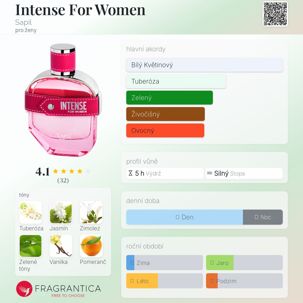 Intense For Women podle Sapil je Floral Fruity vůně pro ženy. Intense For Women byl/a uveden/a v roce 2018. Vrchní tóny jsou Zelené tóny a Pomeranč; střední tóny jsouTuberóza, Jasmín Sambac a Zimolez ; základní tóny jsou Vanilka, Kořen orris a Santalové dřevo.