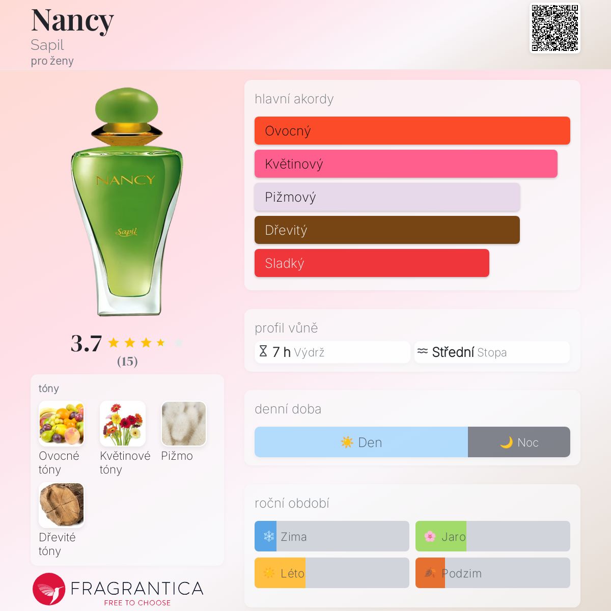 Nancy podle Sapil je Floral vůně pro ženy. Nancy byl/a uveden/a v roce 2004. Vrchní tón je Ovocné tóny ; střední tón jeKvětinové tóny ; základní tóny jsou Pižmo a Dřevité tóny.