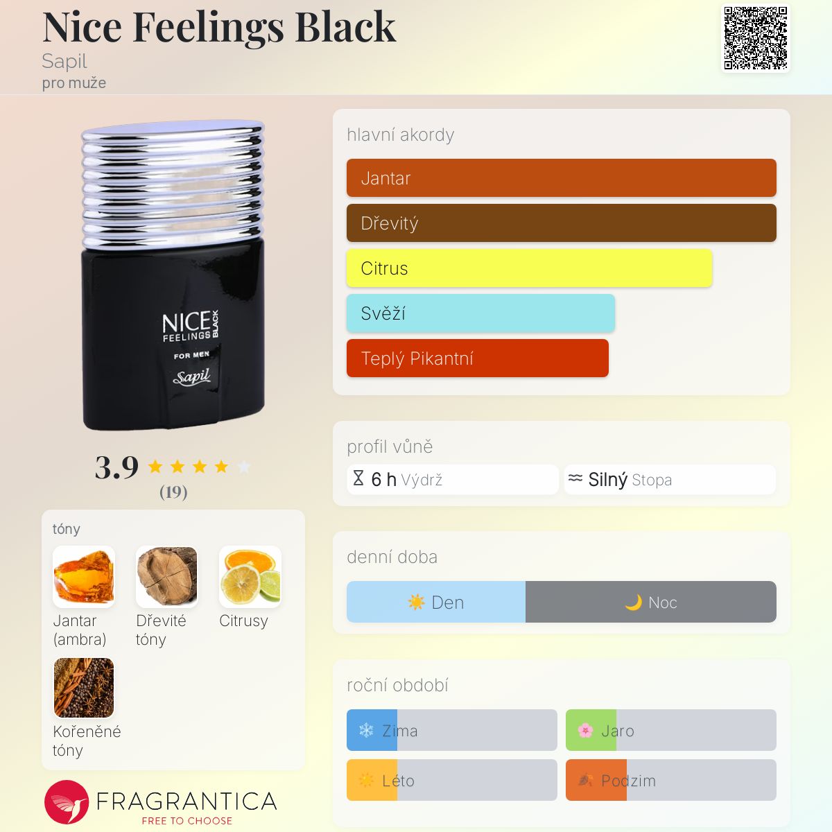Nice Feelings Black podle Sapil je Aromatic Fougere vůně pro muže. Nice Feelings Black byl/a uveden/a v roce 2009. Vrchní tóny jsou Citrusy a Kořeněné tóny; střední tóny jsouJantar (ambra) a Kořeněné tóny ; základní tón je Dřevité tóny.