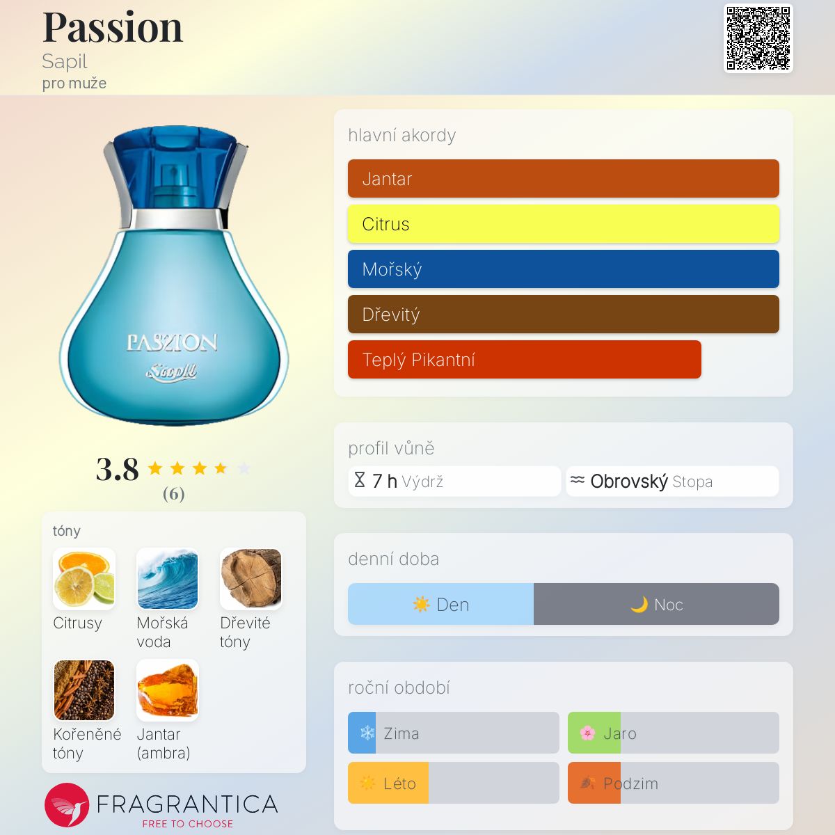 Passion podle Sapil je Woody Aromatic vůně pro muže. Passion byl/a uveden/a v roce 2012. Vrchní tón je Citrusy ; střední tón jeMořské tóny ; základní tóny jsou Dřevité tóny, Kořeněné tóny a Jantar (ambra).
