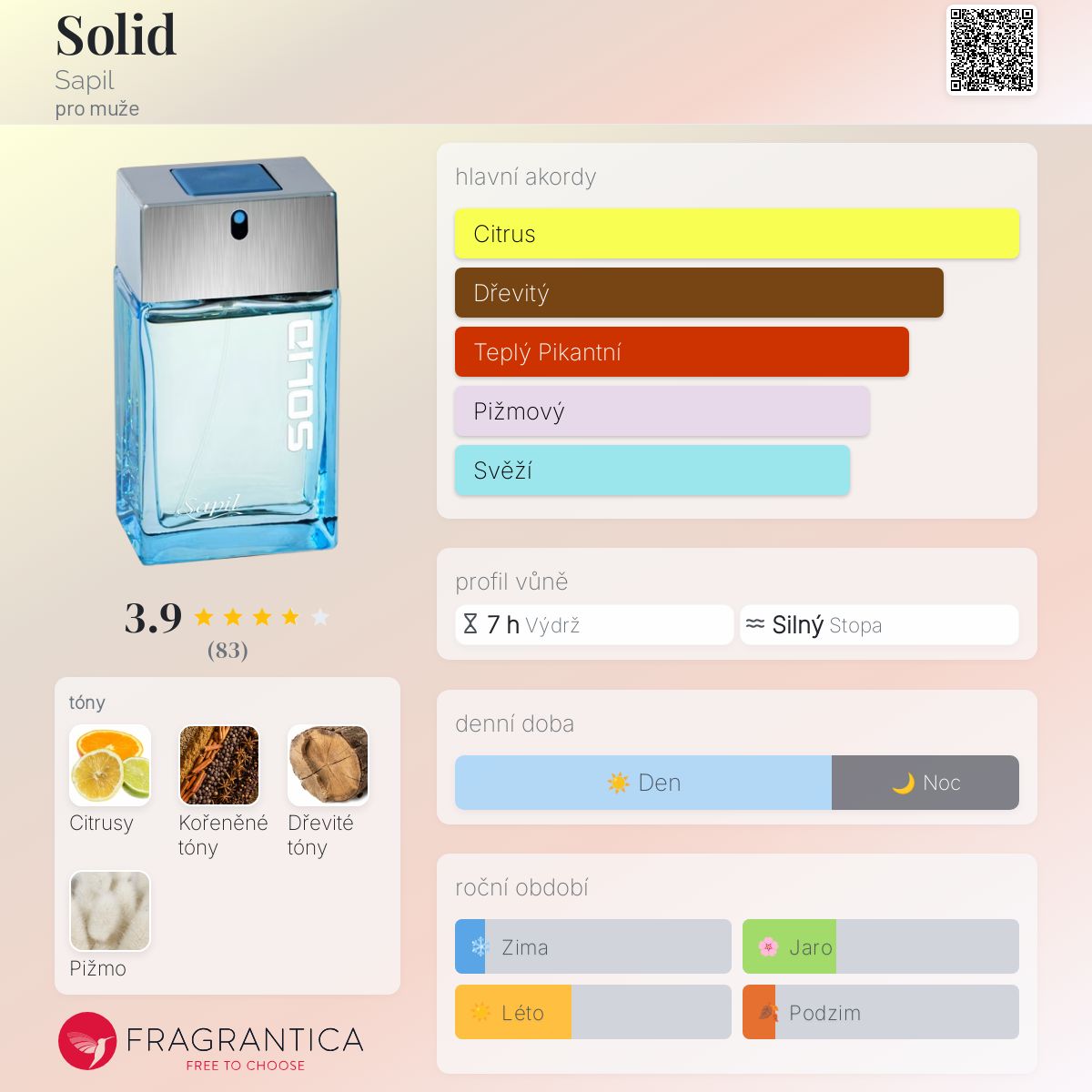 Solid podle Sapil je Aromatic Fougere vůně pro muže. Solid byl/a uveden/a v roce 2007. Vrchní tón je Citrusy ; střední tón jeKořeněné tóny ; základní tóny jsou Dřevité tóny a Pižmo.