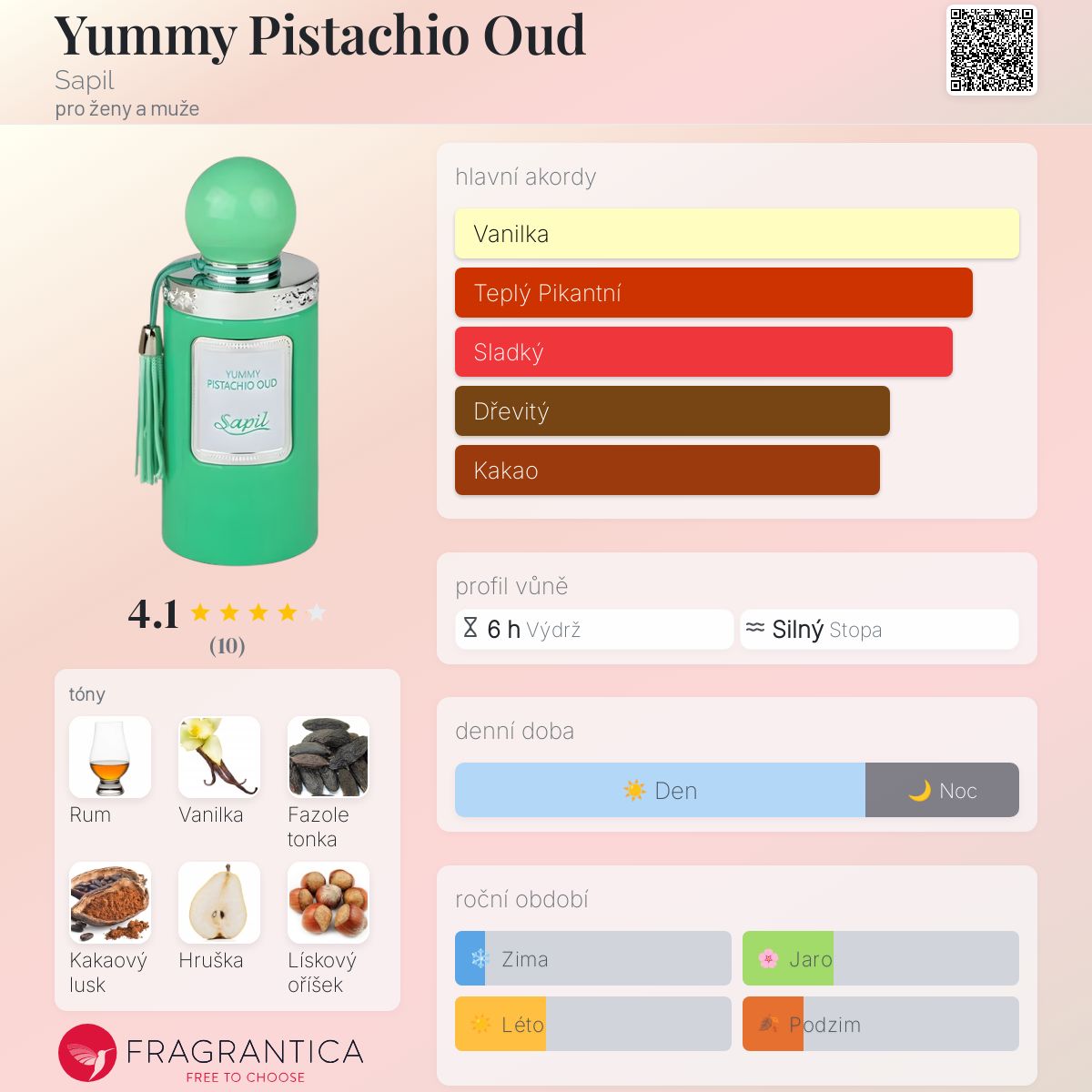 Yummy Pistachio Oud podle Sapil je Floral vůně pro ženy a muže. Toto je nová vůně. Yummy Pistachio Oud byl/a uveden/a v roce 2025. Vrchní tóny jsou Rum, Hruška, Kardamom a Bergamot; střední tóny jsouLískový oříšek, Konvalinka, Růže, Jasmín a Pivoňka ; základní tóny jsou Vanilka, Fazole tonka, Kakao, Santalové dřevo a Cedr.