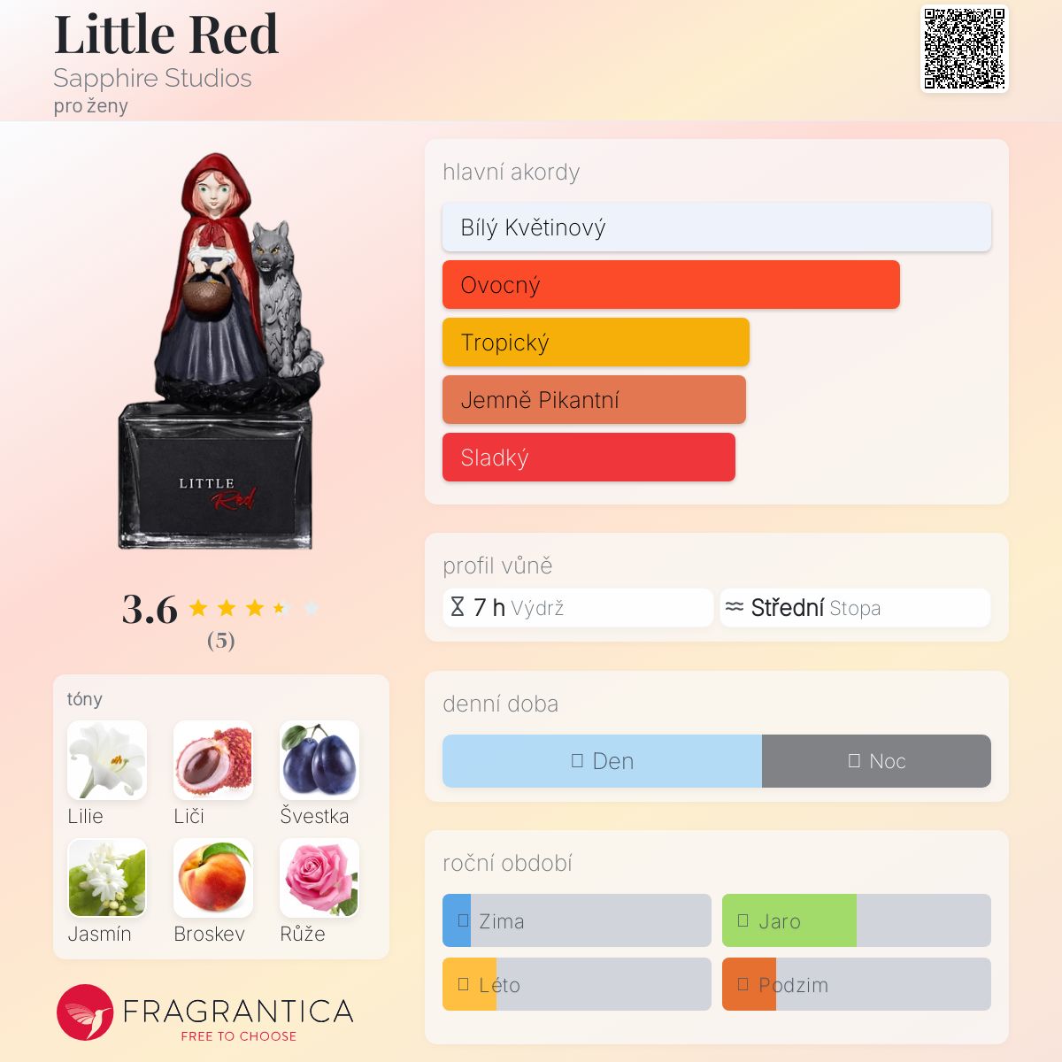 Little Red podle Sapphire Studios je Floral Fruity vůně pro ženy. Little Red byl/a uveden/a v roce 2023. Vrchní tóny jsou Liči, Švestka a Broskev; střední tóny jsouBílá lilie, Jasmín a Růže ; základní tóny jsou Vanilka a Jantar (ambra).