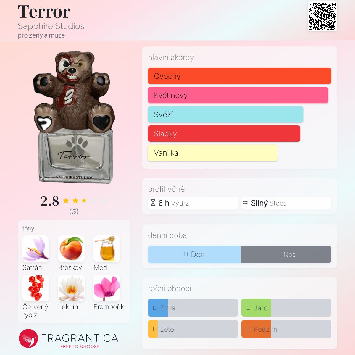 Terror podle Sapphire Studios je Floral vůně pro ženy a muže. Terror byl/a uveden/a v roce 2022. Vrchní tóny jsou Šafrán, Broskev a Med; střední tóny jsouČervený rybíz a Leknín ; základní tóny jsou Brambořík a Vanilka.