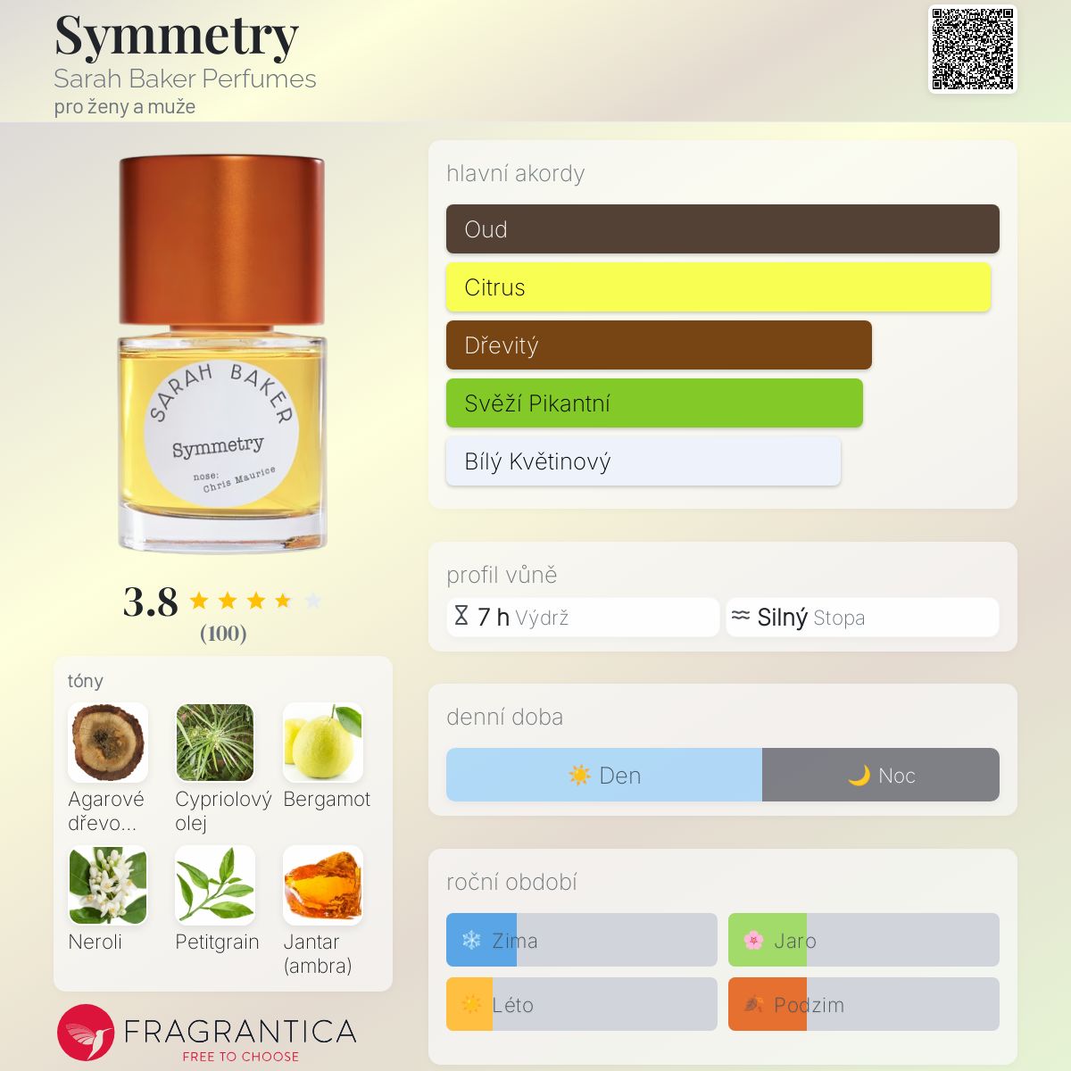 Symmetry podle Sarah Baker Perfumes je Woody Floral Musk vůně pro ženy a muže. Symmetry byl/a uveden/a v roce 2020. "Nosem" za touto vůní je Chris Maurice.