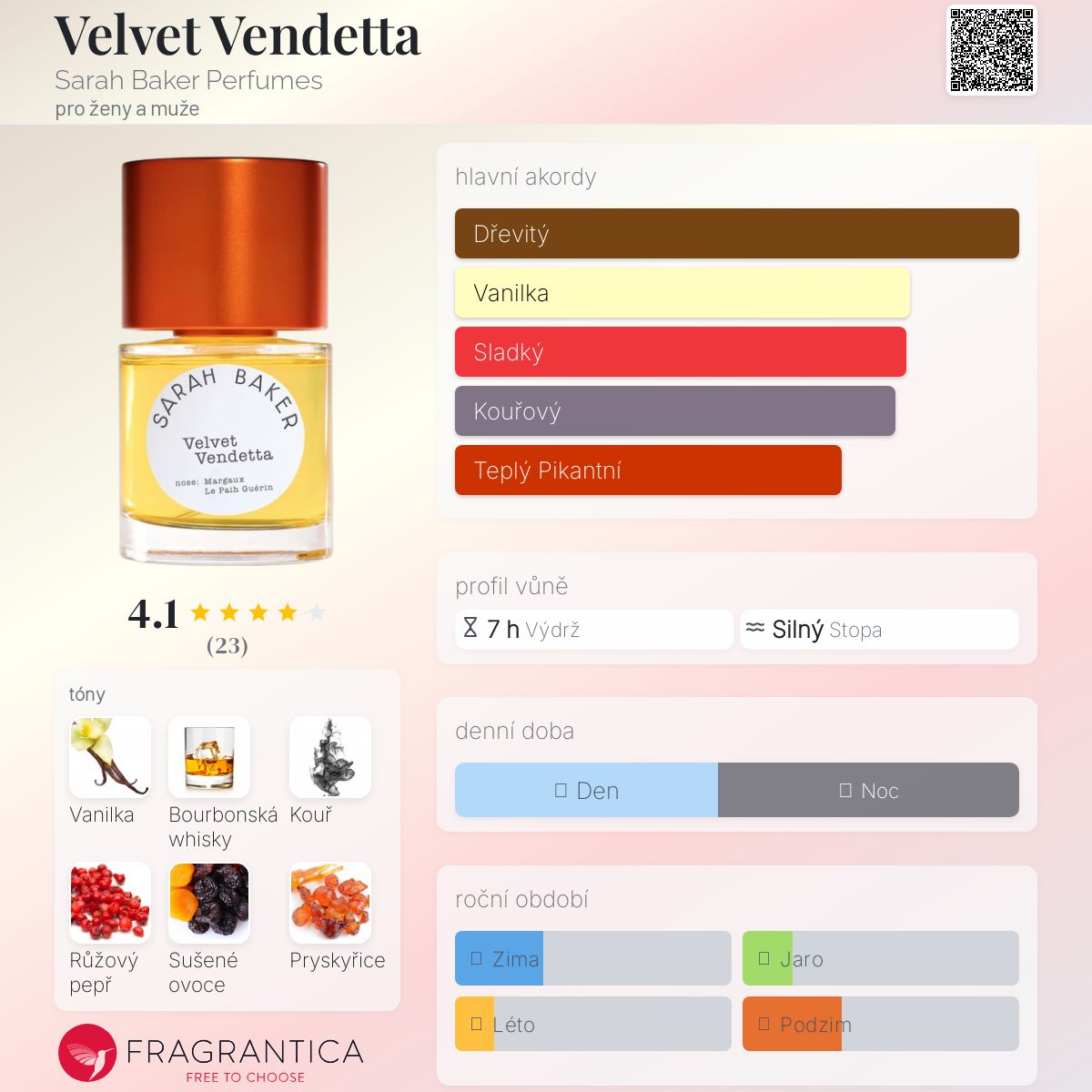 Velvet Vendetta podle Sarah Baker Perfumes je Orientální Vanilla vůně pro ženy a muže. Toto je nová vůně. Velvet Vendetta byl/a uveden/a v roce 2025. "Nosem" za touto vůní je Margaux Le Paih Guérin. Vrchní tóny jsou Kouř, Sušené ovoce, Růžový pepř a Muškátový oříšek; střední tóny jsouVanilka, Bourbonská whisky a Oliva ; základní tóny jsou Vanilka, Černý vanilkový lusk, Tabák, Dřevité tóny a Pryskyřice.