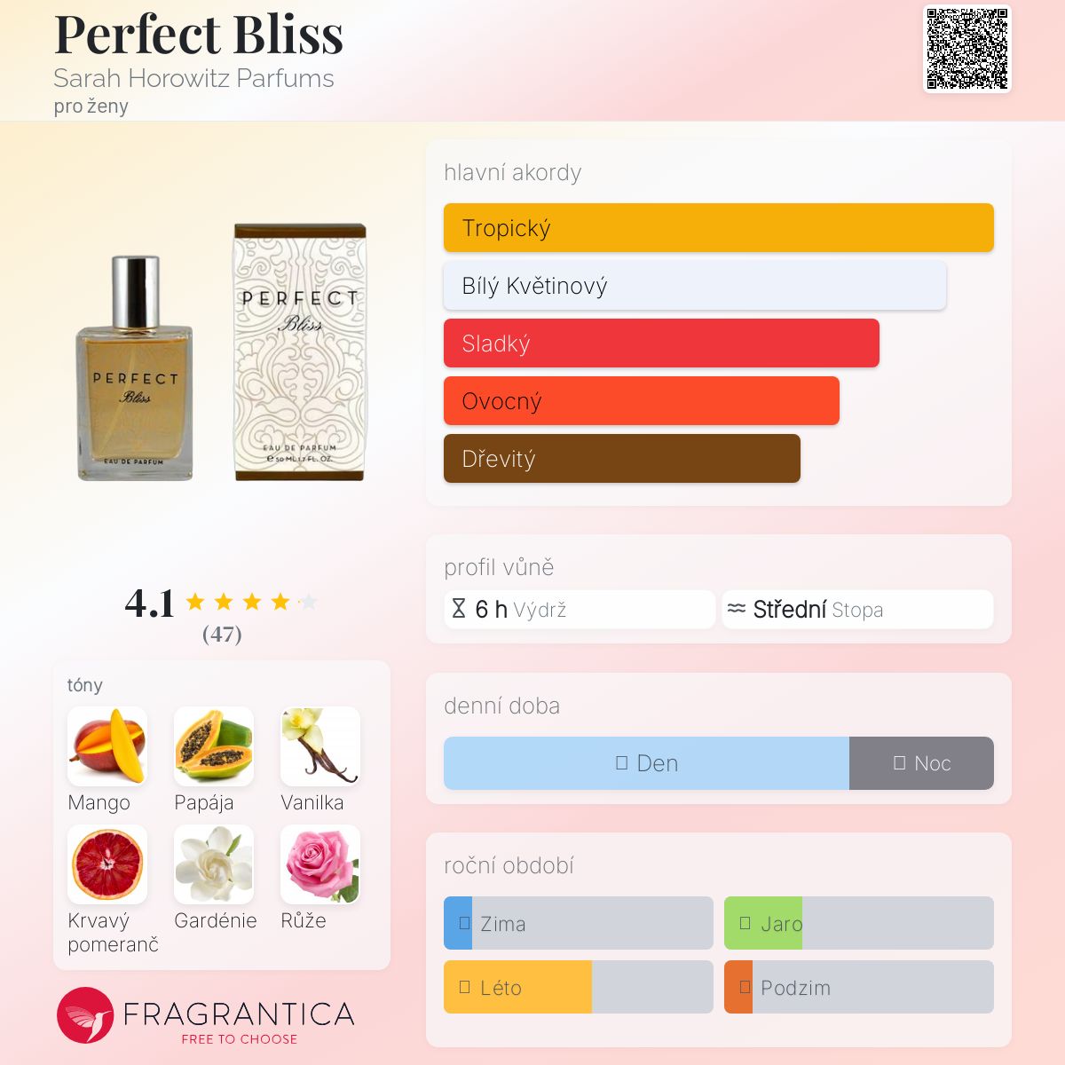 Perfect Bliss podle Sarah Horowitz Parfums je Floral Fruity vůně pro ženy. Perfect Bliss byl/a uveden/a v roce 2002. "Nosem" za touto vůní je Sarah Horowitz. Vrchní tóny jsou Mango, Papája a Krvavý pomeranč; střední tóny jsouGardénie, Růže, Tuberóza a Lilie ; základní tóny jsou Vanilka, Pačuli, Pižmo a Cedr.