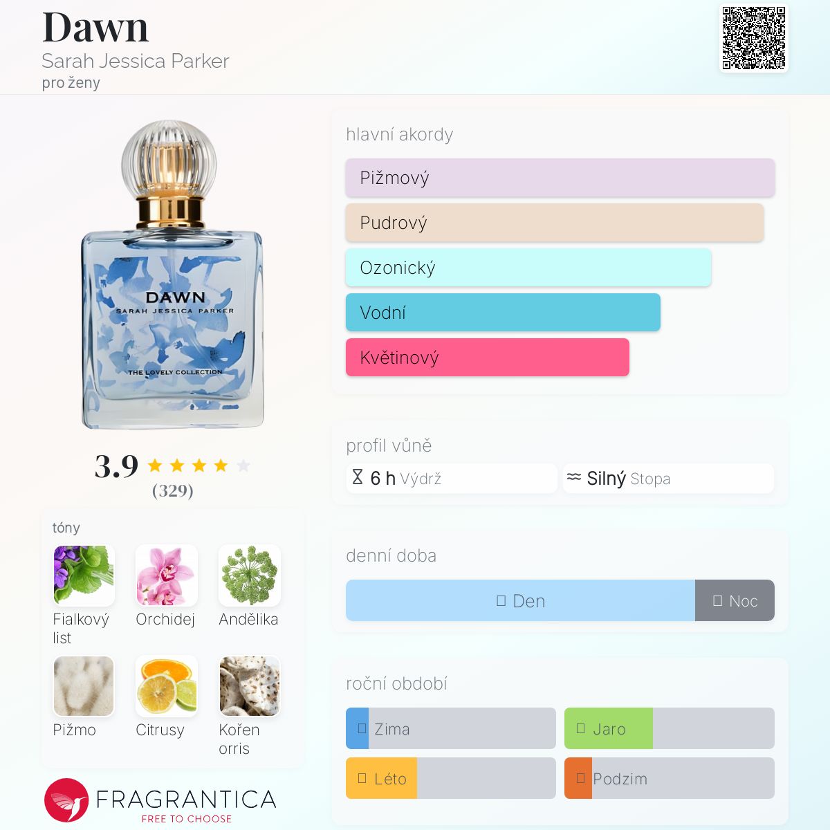Dawn podle Sarah Jessica Parker je Floral Green vůně pro ženy. Dawn byl/a uveden/a v roce 2009. "Nosem" za touto vůní je Stephen Nilsen. Vrchní tóny jsou Fialkový list, Andělika a Citrusy; střední tón jeOrchidej ; základní tóny jsou Pižmo, Kořen orris, Vanilka, Dubový mech a Vetiver.