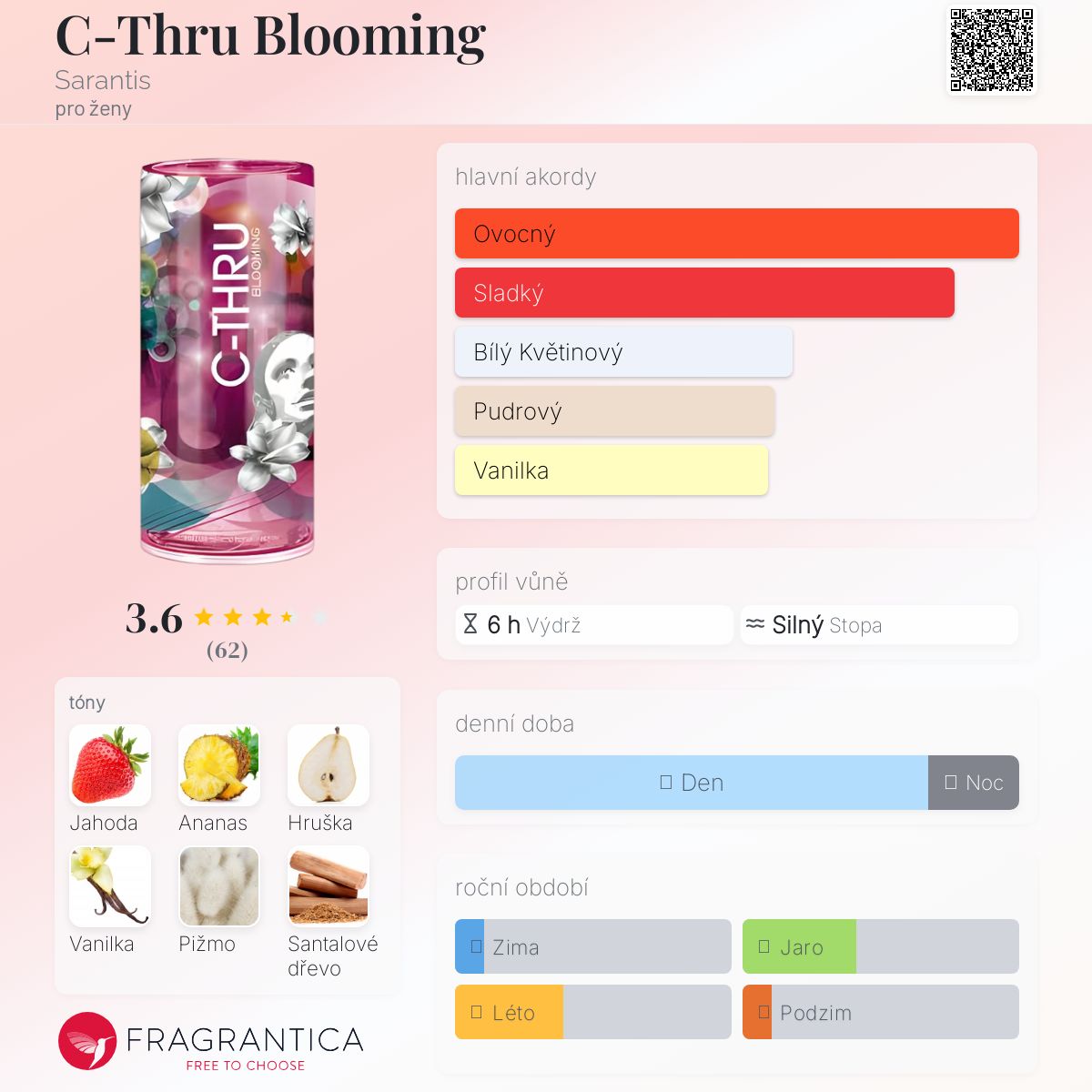 C-Thru Blooming podle Sarantis je Floral Fruity vůně pro ženy. C-Thru Blooming byl/a uveden/a v roce 2012. Vrchní tóny jsou Velká jahoda, Ananas a Hruška; střední tóny jsouPomerančový květ, Zimolez a Čaj ; základní tóny jsou Vanilka, Pižmo a Santalové dřevo.