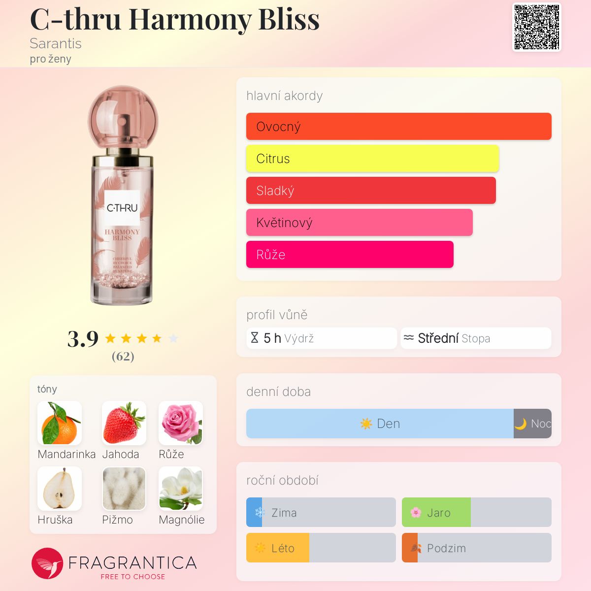 C-thru Harmony Bliss podle Sarantis je Floral Fruity vůně pro ženy. C-thru Harmony Bliss byl/a uveden/a v roce 2019. Vrchní tóny jsou Mandarinka, Jahoda a Hruška; střední tóny jsouOkvětní lístky růží, Magnólie a Jasmín ; základní tóny jsou Bílé pižmo, Dřevité tóny a Jantar (ambra).