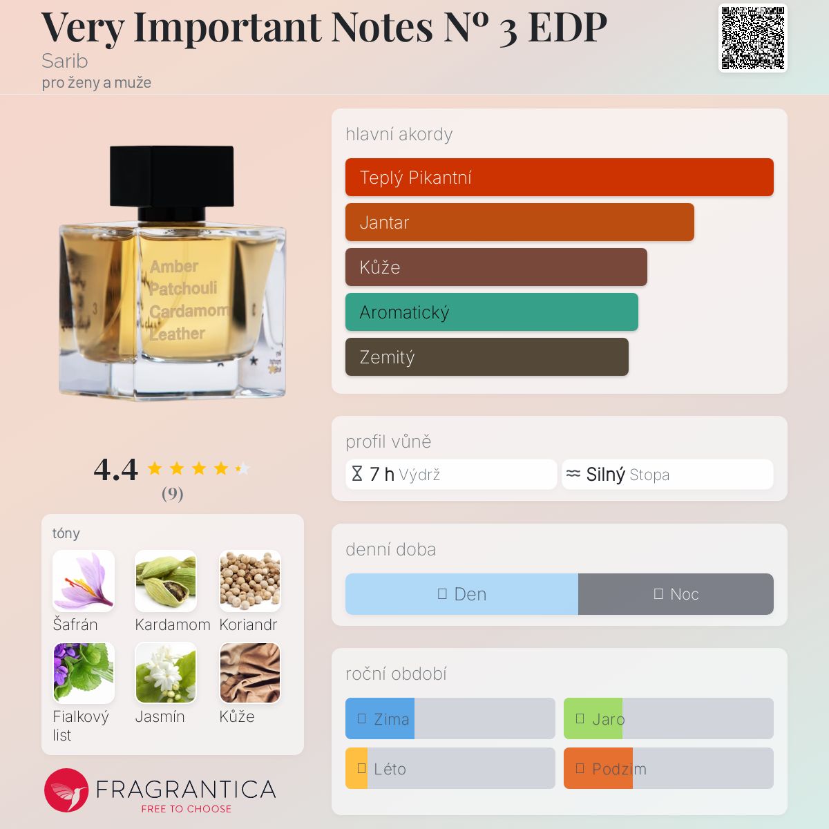 Very Important Notes Nº 3 EDP podle Sarib je Orientální vůně pro ženy a muže. Very Important Notes Nº 3 EDP byl/a uveden/a v roce 2020. Vrchní tóny jsou Šafrán, Kardamom a Koriandr; střední tóny jsouFialkové listy, Jasmín a Kůže ; základní tóny jsou Dubový mech, Pačuli, Jantar (ambra) a Kadidlo.