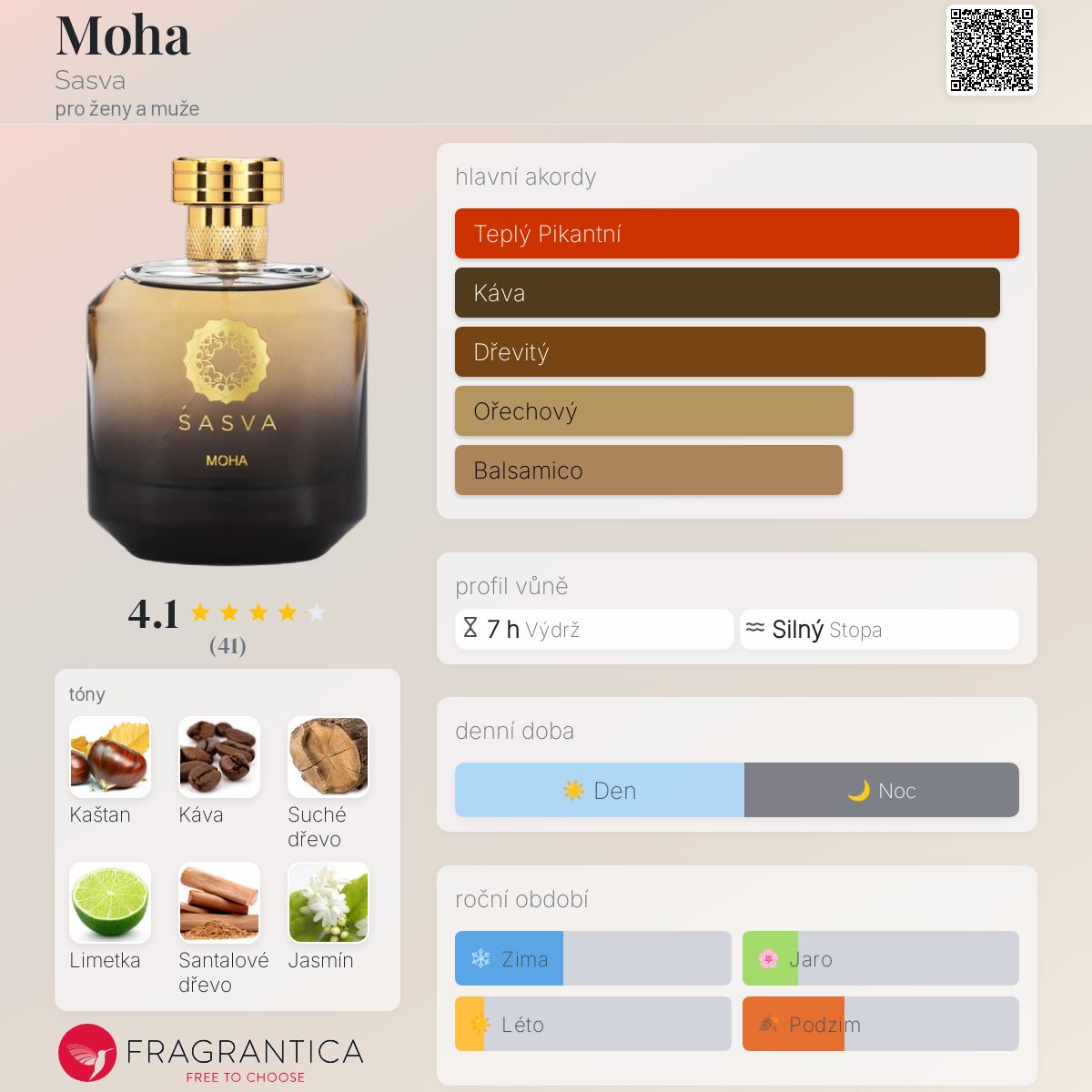 Moha podle Sasva je vůně pro ženy a muže. Moha byl/a uveden/a v roce 2023. "Nosem" za touto vůní je Laurent Marrone. Vrchní tóny jsou Kaštan, Káva a Limetka; střední tóny jsouSuché dřevo, Santalové dřevo a Jasmín ; základní tóny jsou Karamel, Pižmo, Vanilka a Jantar (ambra).