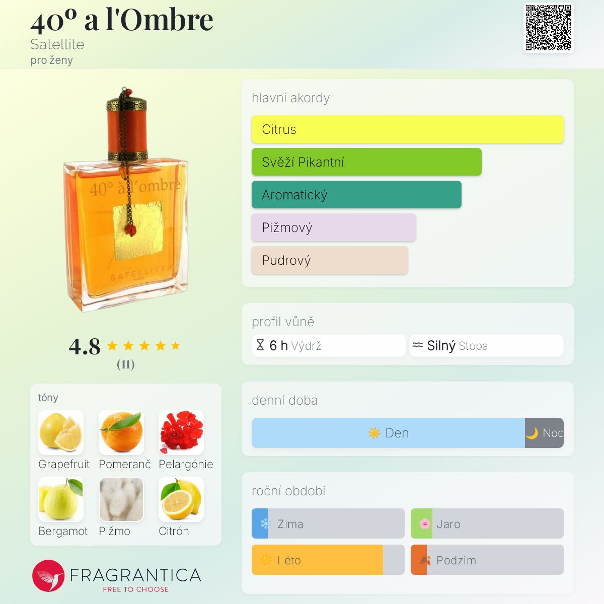 40º a l'Ombre podle Satellite je Floral Aldehyde vůně pro ženy. Vrchní tóny jsou Grapefruit, Pomeranč, Bergamot, Citron amalfi a Aldehydy; střední tóny jsouPelargónie, Levandule a Jasmín ; základní tóny jsou Pižmo, Santalové dřevo a Pačuli.