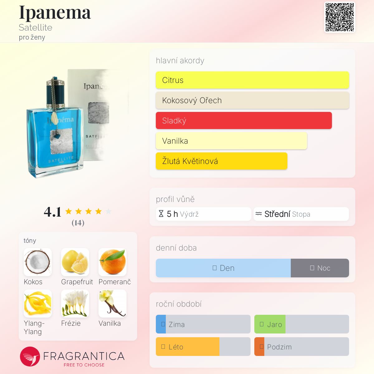 Ipanema podle Satellite je Orientální Floral vůně pro ženy. Ipanema byl/a uveden/a v roce 2007. Vrchní tóny jsou Grapefruit, Pomeranč a Ylang-Ylang; střední tóny jsouKokos, Frézie, Bílé květy a Santalové dřevo ; základní tóny jsou Vanilka, Pačuli a Fazole tonka.