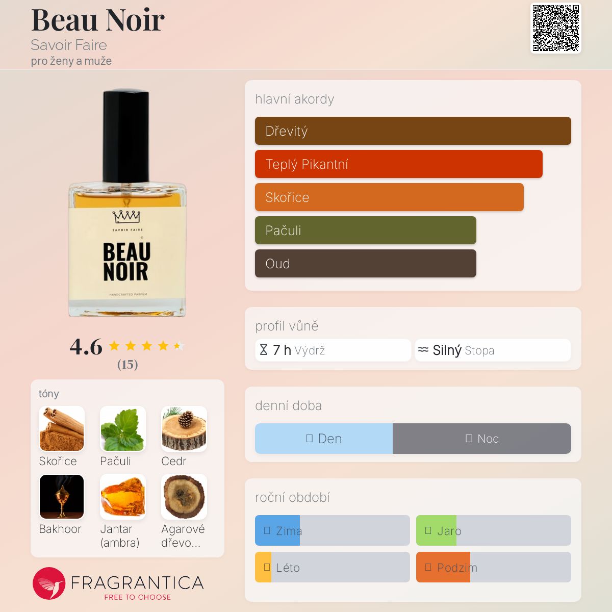 Beau Noir podle Savoir Faire je Orientální Woody vůně pro ženy a muže. Beau Noir byl/a uveden/a v roce 2021. "Nosem" za touto vůní je Chris Classic.